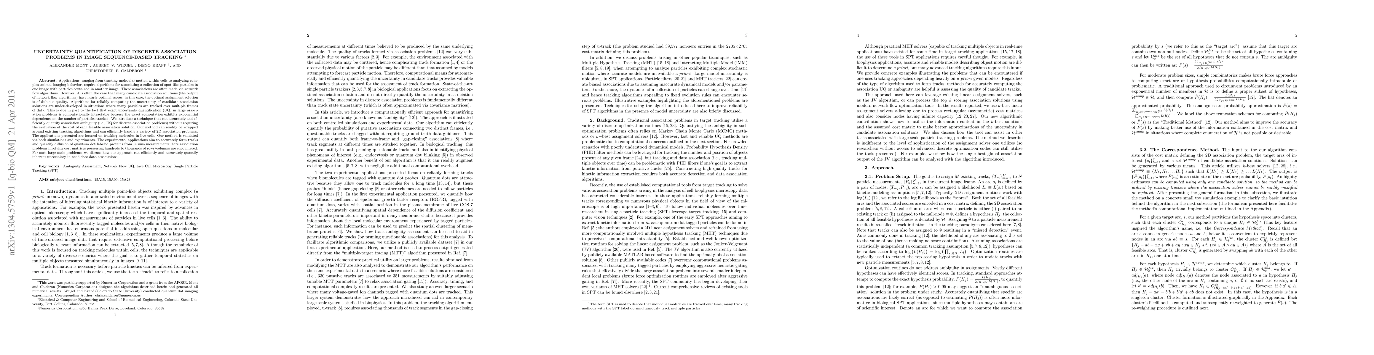 Applications, ranging from tracking molecular motion within cells to analyzing complex animal foraging behavior, require algorithms for associating a collection of spot-like particles in one image with particles contained in another image. These associations are often made via network flow algorithms. However, it is often the case that many candidate association solutions (the output of network flow algorithms) have nearly optimal scores; in this case, the optimal assignment solution is of dubious quality. Algorithms for reliably computing the uncertainty of candidate association solutions are under-developed in situations where many particles are tracked over multiple frames of data. This is due in part to the fact that exact uncertainty quantification (UQ) in large association problems is computationally intractable because the exact computation exhibits exponential dependence on the number of particles tracked. We introduce a technique that can accurately and efficiently quantify association ambiguity (i.e., UQ for discrete association problems) without requiring the evaluation of the cost of each feasible association solution. Our method can readily be wrapped around existing tracking algorithms and can efficiently handle a variety of 2D association problems. The applications presented are focused on tracking molecules in live cells. Our method is validated via both simulations and experiments. The experimental applications aim to accurately form tracks and quantify diffusion of quantum dot labeled proteins from \emph{in vivo} measurements; here association problems involving cost matrices possessing hundreds to thousands of rows/columns are encountered. For such large-scale problems, we discuss how our approach can efficiently and accurately quantify inherent uncertainty in candidate data associations.