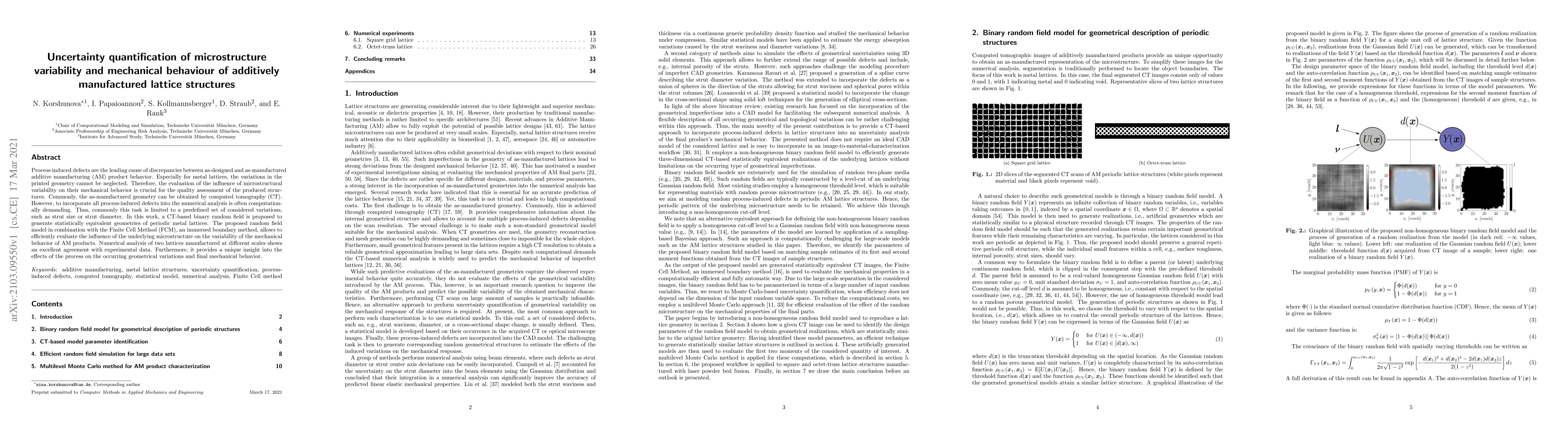 This paper proposes a CT-based binary random field model combined with the Finite Cell Method to quantify the impact of microstructure variability on the mechanical behavior of additively manufactured metal lattices. The approach efficiently evaluates process-induced defects and their effects on lattice performance, showing good agreement with experimental data.
