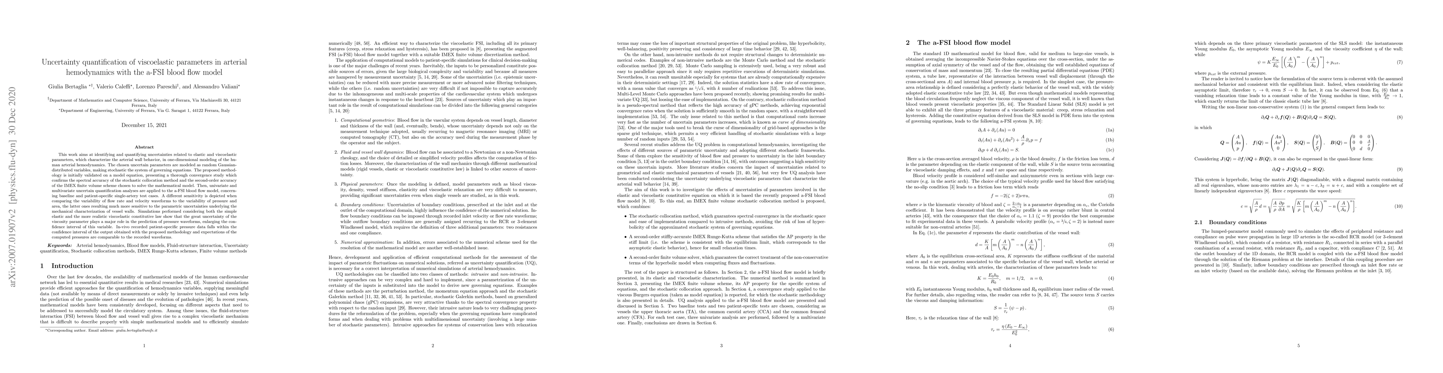 This work aims at identifying and quantifying uncertainties related to elastic and viscoelastic parameters, which characterize the arterial wall behavior, in one-dimensional modeling of the human arterial hemodynamics. The chosen uncertain parameters are modeled as random Gaussian-distributed variables, making stochastic the system of governing equations. The proposed methodology is initially validated on a model equation, presenting a thorough convergence study which confirms the spectral accuracy of the stochastic collocation method and the second-order accuracy of the IMEX finite volume scheme chosen to solve the mathematical model. Then, univariate and multivariate uncertain quantification analyses are applied to the a-FSI blood flow model, concerning baseline and patient-specific single-artery test cases. A different sensitivity is depicted when comparing the variability of flow rate and velocity waveforms to the variability of pressure and area, the latter ones resulting much more sensitive to the parametric uncertainties underlying the mechanical characterization of vessel walls. Simulations performed considering both the simple elastic and the more realistic viscoelastic constitutive law show that the great uncertainty of the viscosity parameter plays a major role in the prediction of pressure waveforms, enlarging the confidence interval of this variable. In-vivo recorded patient-specific pressure data falls within the confidence interval of the output obtained with the proposed methodology and expectations of the computed pressures are comparable to the recorded waveforms.