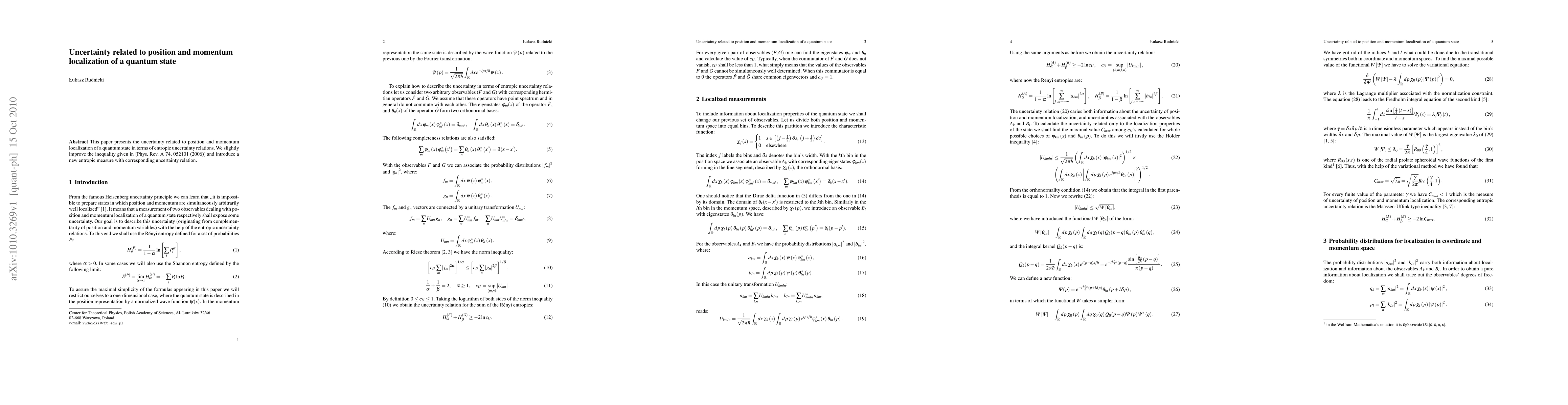 This paper presents the uncertainty related to position and momentum localization of a quantum state in terms of entropic uncertainty relations. We slightly improve the inequality given in [Phys. Rev. A 74, 052101 (2006)] and introduce a new entropic measure with corresponding uncertainty relation.