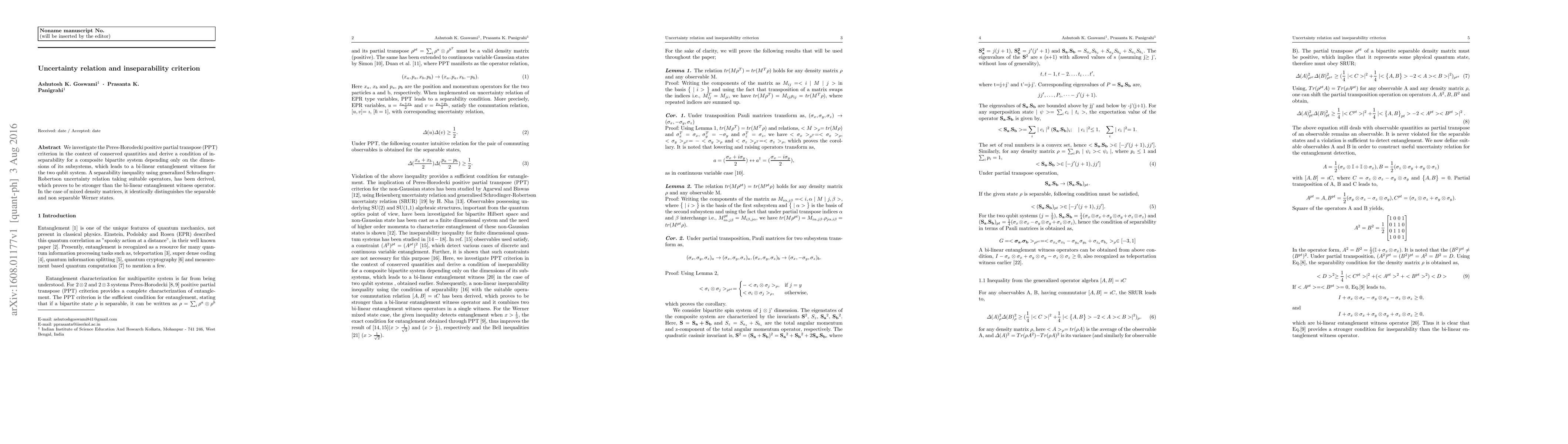We investigate the Peres-Horodecki positive partial transpose (PPT) criterion in the context of conserved quantities and derive a condition of in- separability for a composite bipartite system depending only on the dimen- sions of its subsystems, which leads to a bi-linear entanglement witness for the two qubit system. A separability inequality using generalized Schrodinger- Robertson uncertainty relation taking suitable operators, has been derived, which proves to be stronger than the bi-linear entanglement witness operator. In the case of mixed density matrices, it identically distinguishes the separable and non separable Werner states.