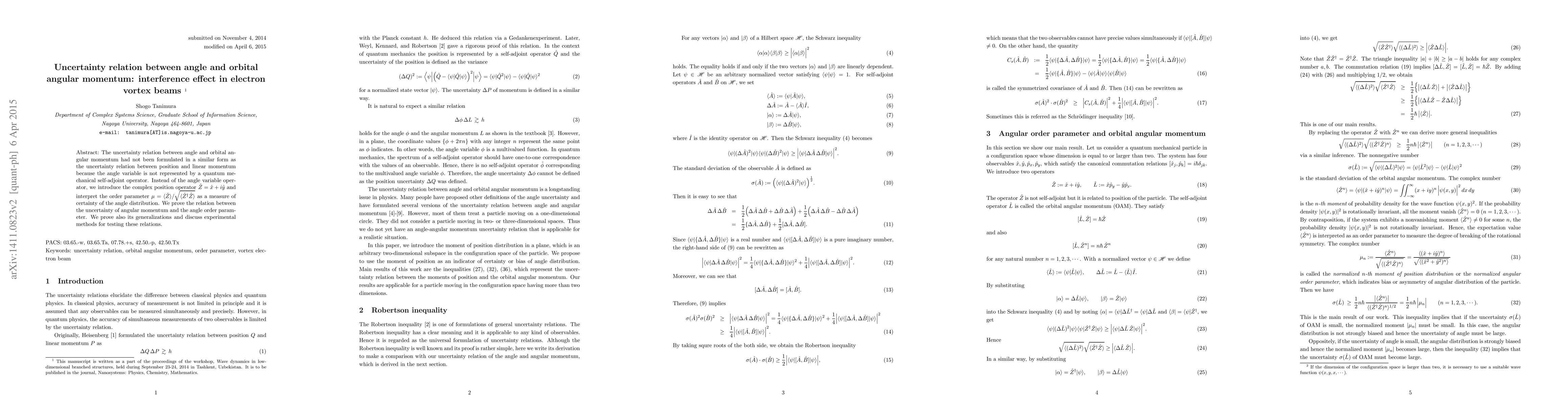 This paper formulates a new uncertainty relation between angle and orbital angular momentum using the complex position operator $\hat{Z}$, and introduces an angle order parameter $\mu$ to measure angle certainty. It also discusses experimental methods for testing these relations.