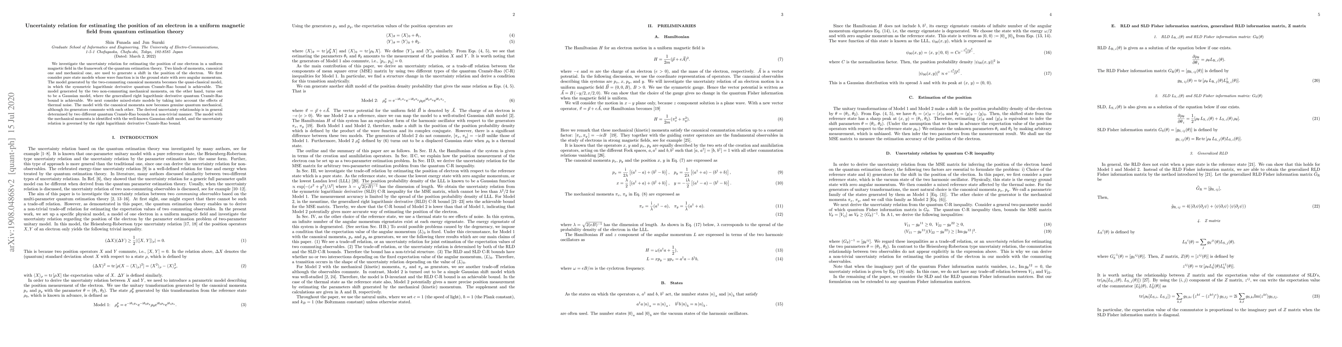 We investigate the uncertainty relation for estimating the position of one electron in a uniform magnetic field in the framework of the quantum estimation theory. Two kinds of momenta, canonical one and mechanical one, are used to generate a shift in the position of the electron. We first consider pure state models whose wave function is in the ground state with zero angular momentum. The model generated by the two-commuting canonical momenta becomes the quasi-classical model, in which the symmetric logarithmic derivative quantum Cram\'er-Rao bound is achievable. The model generated by the two non-commuting mechanical momenta, on the other hand, turns out to be a Gaussian model, where the generalized right logarithmic derivative quantum Cram\'er-Rao bound is achievable. We next consider mixed-state models by taking into account the effects of thermal noise. The model with the canonical momenta now becomes genuine quantum mechanical, although its generators commute with each other. The derived uncertainty relationship is in general determined by two different quantum Cram\'er-Rao bounds in a non-trivial manner. The model with the mechanical momenta is identified with the well-known Gaussian shift model, and the uncertainty relation is governed by the right logarithmic derivative Cram\'er-Rao bound.