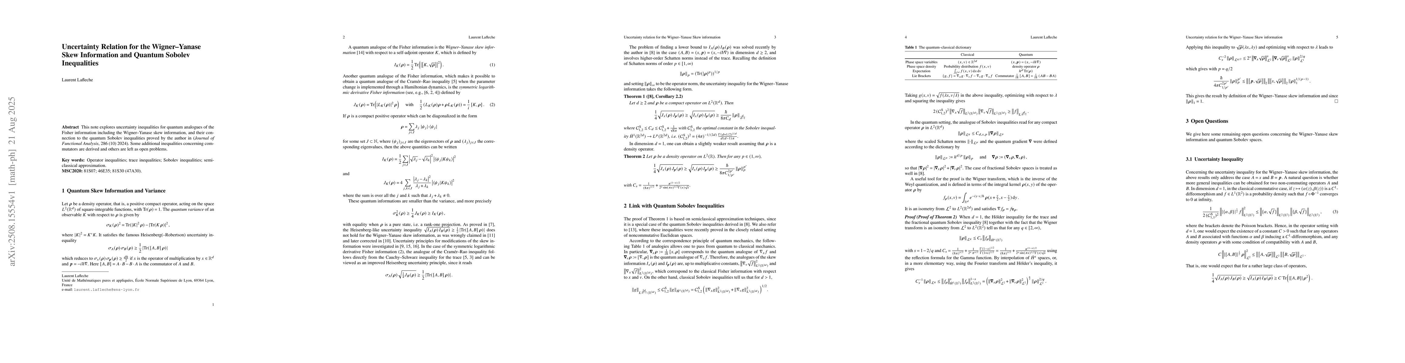 This note explores uncertainty inequalities for quantum analogues of the Fisher information including the Wigner-Yanase skew information, and their connection to the quantum Sobolev inequalities proved by the author in [Journal of Functional Analysis, 286 (10) 2024]. Some additional inequalities concerning commutators are derived and others are left as open problems.