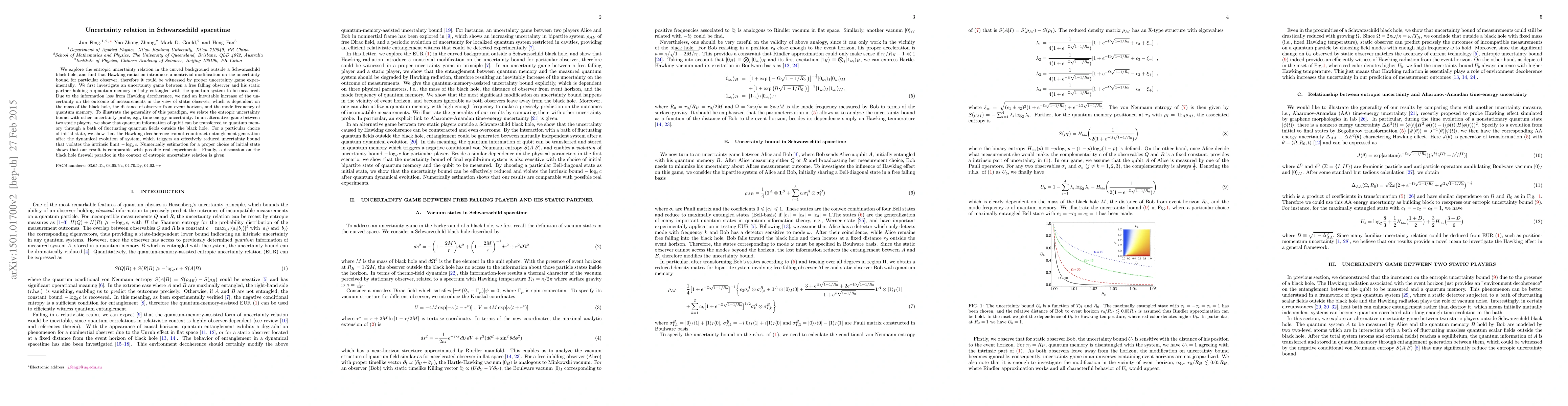 We explore the entropic uncertainty relation in the curved background outside a Schwarzschild black hole, and find that Hawking radiation introduces a nontrivial modification on the uncertainty bound for particular observer, therefore it could be witnessed by proper uncertainty game experimentally. We first investigate an uncertainty game between a free falling observer and his static partner holding a quantum memory initially entangled with the quantum system to be measured. Due to the information loss from Hawking decoherence, we find an inevitable increase of the uncertainty on the outcome of measurements in the view of static observer, which is dependent on the mass of the black hole, the distance of observer from event horizon, and the mode frequency of quantum memory. To illustrate the generality of this paradigm, we relate the entropic uncertainty bound with other uncertainty probe, e.g., time-energy uncertainty. In an alternative game between two static players, we show that quantum information of qubit can be transferred to quantum memory through a bath of fluctuating quantum fields outside the black hole. For a particular choice of initial state, we show that the Hawking decoherence cannot counteract entanglement generation after the dynamical evolution of system, which triggers an effectively reduced uncertainty bound that violates the intrinsic limit $-\log_2c$. Numerically estimation for a proper choice of initial state shows that our result is comparable with possible real experiments. Finally, a discussion on the black hole firewall paradox in the context of entropic uncertainty relation is given.