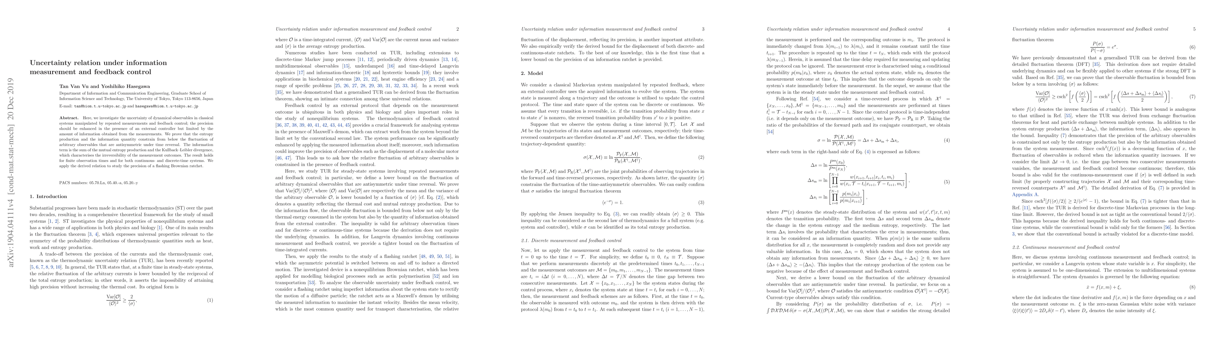 This paper explores the uncertainty in classical systems under measurement and feedback control, demonstrating that entropy production and information quantity constrain the fluctuation of antisymmetric observables. The results apply to both continuous- and discrete-time systems and are illustrated through the precision analysis of a flashing Brownian ratchet.