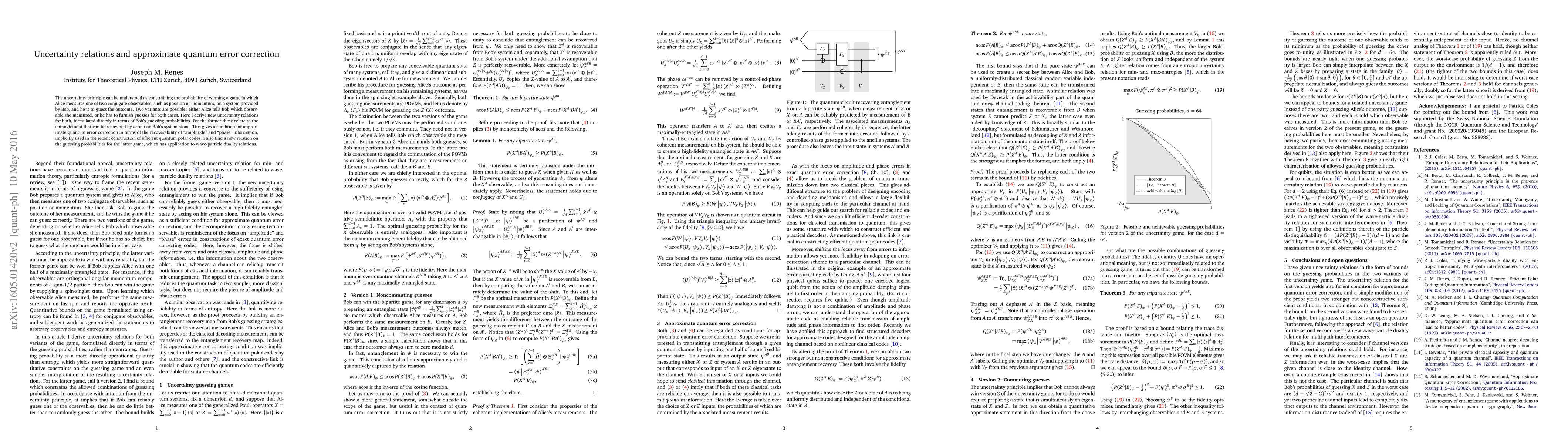 The uncertainty principle can be understood as constraining the probability of winning a game in which Alice measures one of two conjugate observables, such as position or momentum, on a system provided by Bob, and he is to guess the outcome. Two variants are possible: either Alice tells Bob which observable she measured, or he has to furnish guesses for both cases. Here I derive new uncertainty relations for both, formulated directly in terms of Bob's guessing probabilities. For the former these relate to the entanglement that can be recovered by action on Bob's system alone. This gives a condition for approximate quantum error correction in terms of the recoverability of "amplitude" and "phase" information, implicitly used in the recent construction of efficient quantum polar codes. I also find a tight relation on the guessing probabilities for the latter game, which has application to wave-particle duality relations.