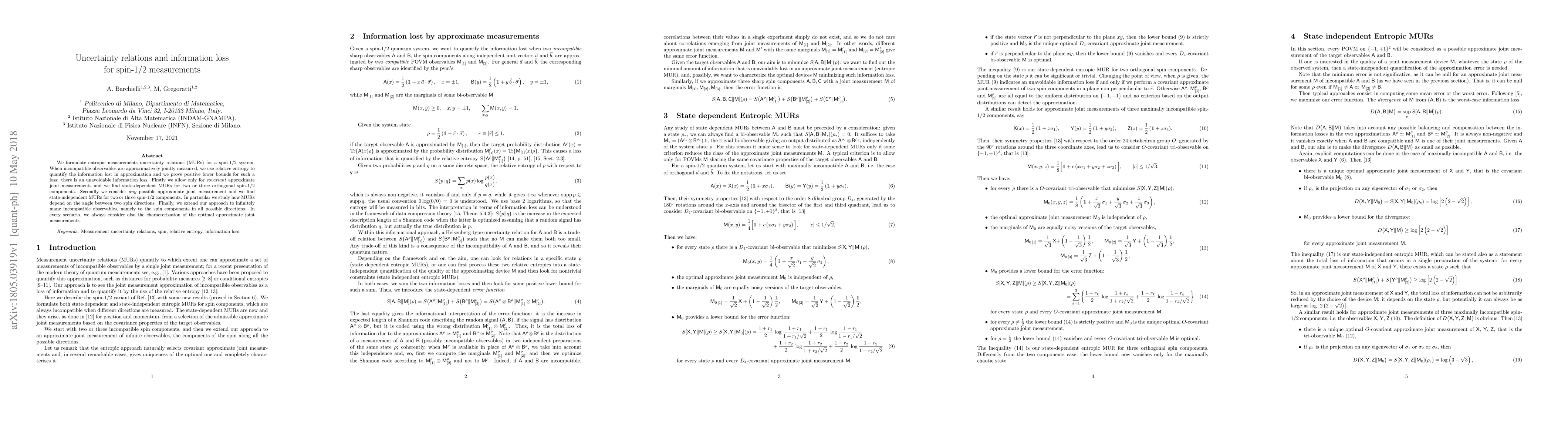 The paper introduces state-dependent and state-independent entropic MURs for spin-1/2 components, providing a comprehensive analysis of information loss in approximate joint measurements of quantum observables.