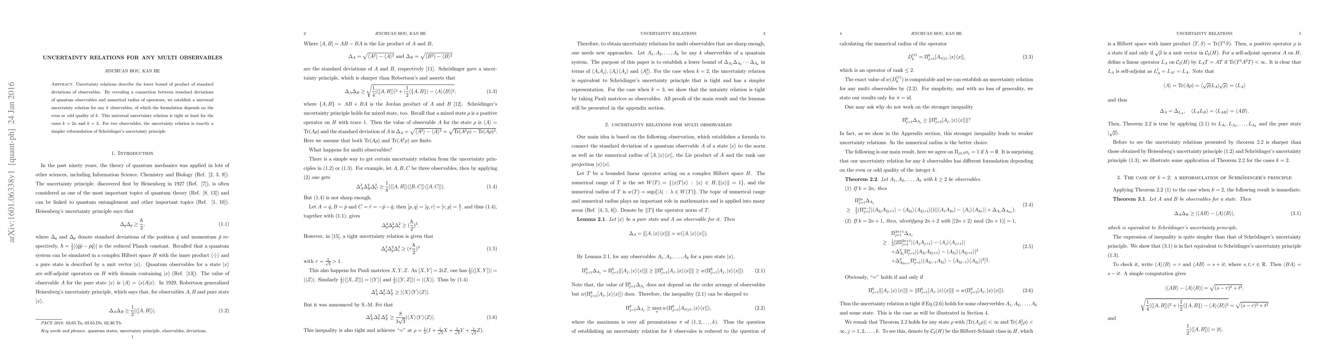 Summary: This paper establishes a universal uncertainty relation for any $k$ quantum observables, revealing a connection between their standard deviations and the numerical radius of operators, which is tight for $k=2n$ and $k=3$. For two observables, it simplifies to Schrödinger's uncertainty principle.