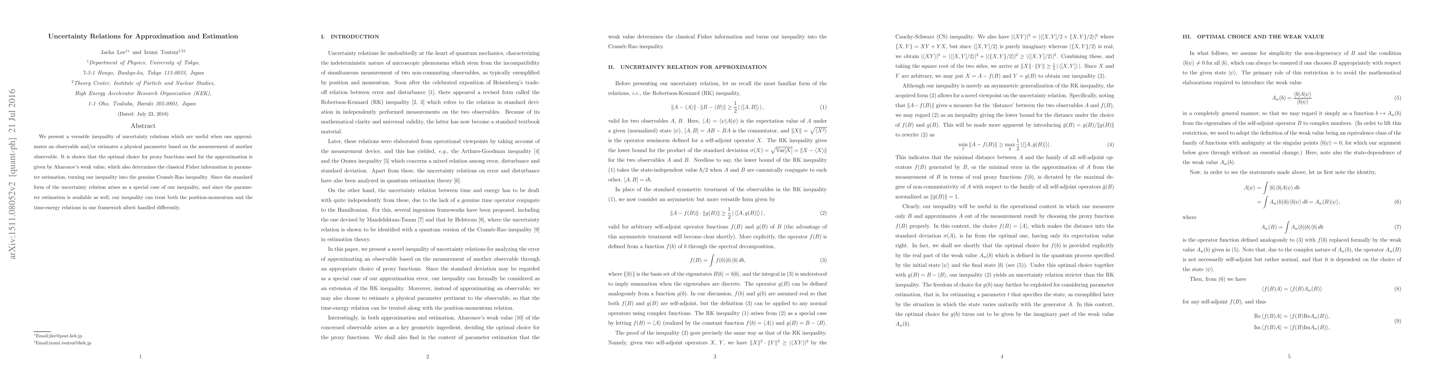 A new uncertainty relation is proposed for approximating observables and estimating physical parameters, which optimizes proxy functions to Aharonov's weak value and achieves the Cram{''r}-Rao inequality in parameter estimation.