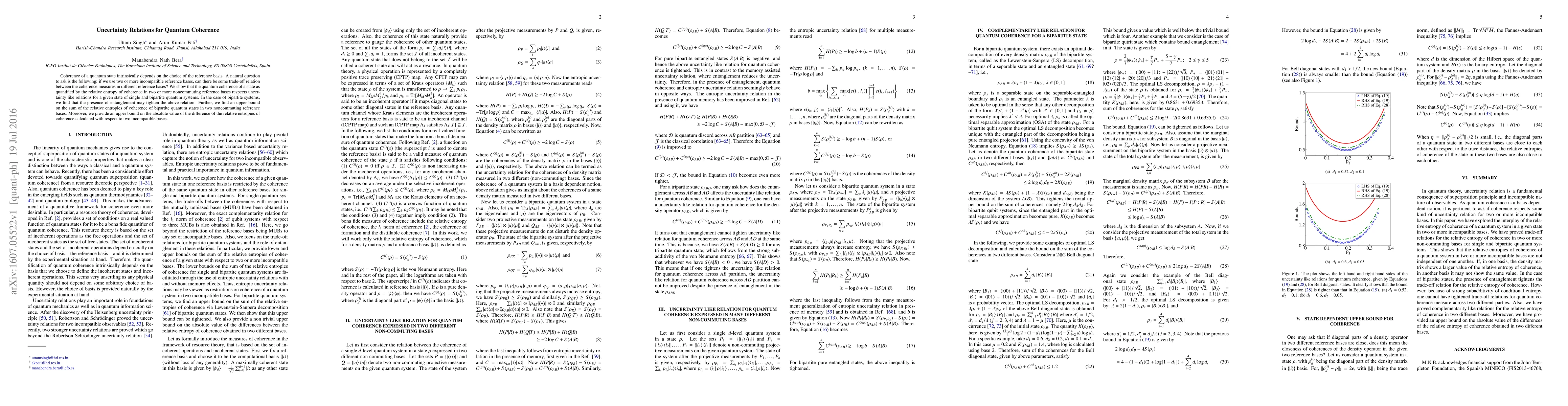 This paper explores uncertainty relations for quantum coherence, demonstrating that coherence measures in incompatible reference bases exhibit uncertainty-like relations. It also reveals that entanglement can strengthen these relations in bipartite systems, providing bounds on the sum and difference of coherence measures.