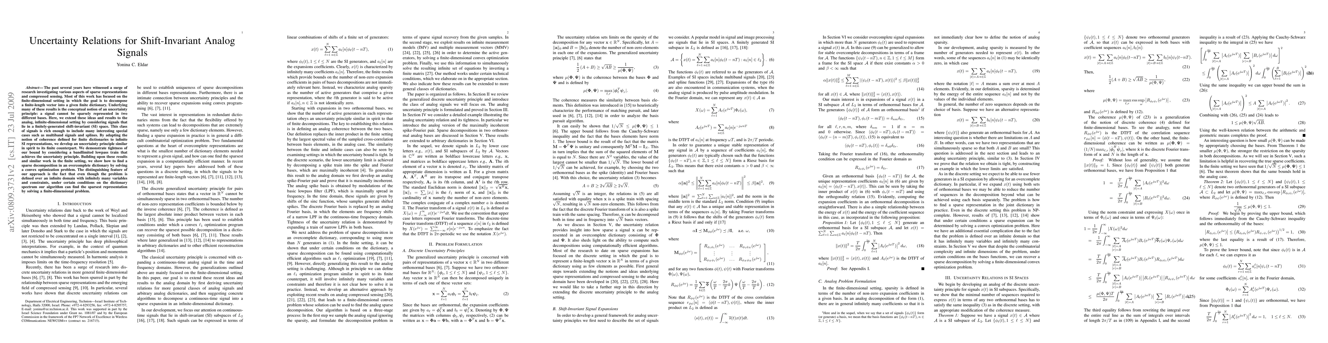 This paper introduces an uncertainty principle for shift-invariant analog signals, adapting a finite-dimensional concept to infinite dimensions and providing a method to find sparse decompositions in overcomplete dictionaries.