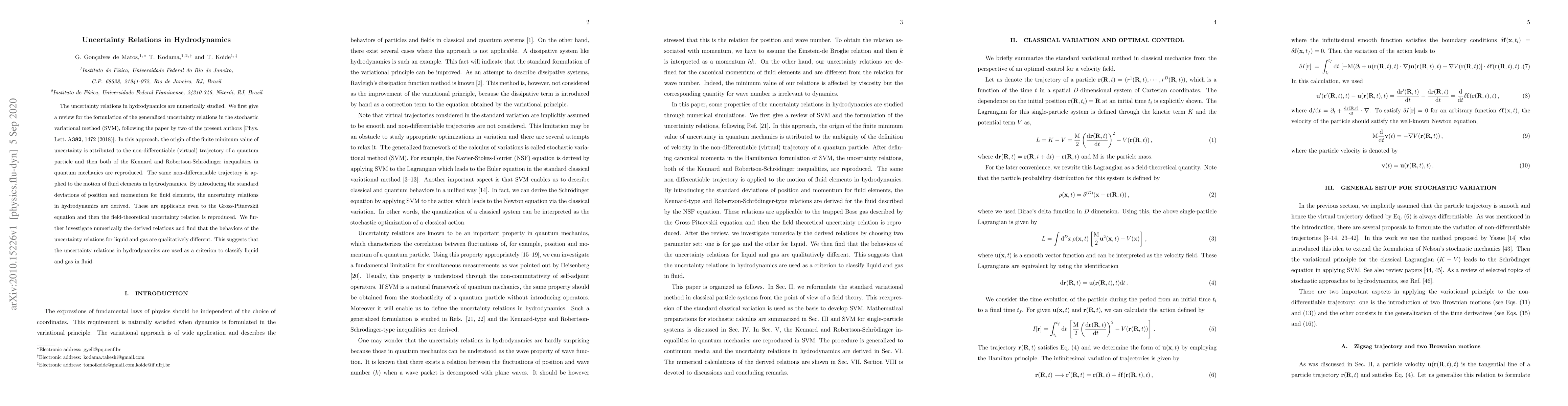 This research numerically studies uncertainty relations in hydrodynamics, deriving them from the stochastic variational method. It finds that the behaviors of these relations differ qualitatively between liquids and gases, suggesting their potential as a classification criterion for fluid states.
