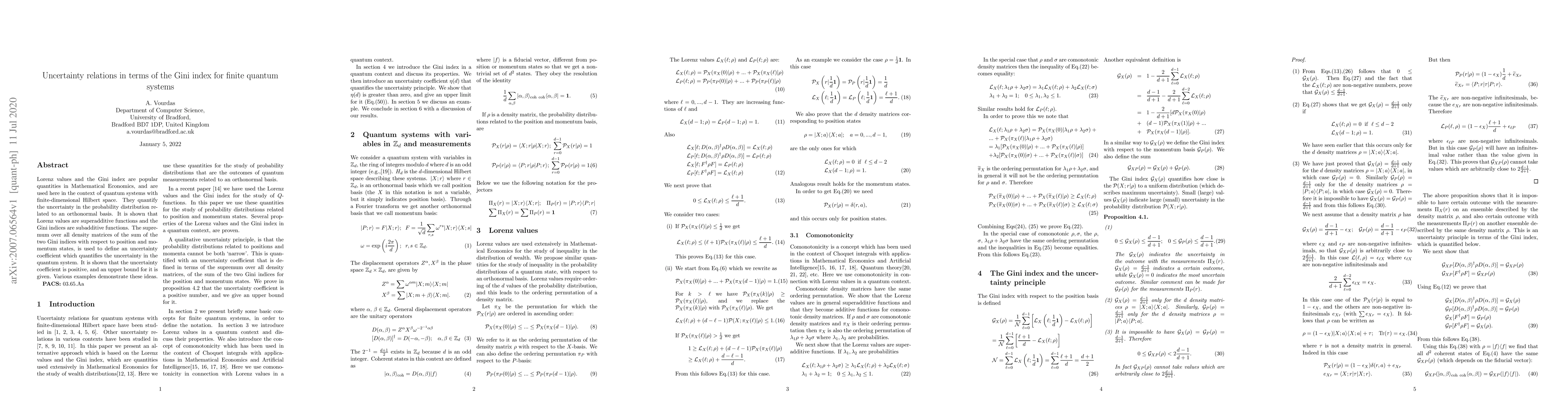 This paper explores the application of the Gini index and Lorenz values from Mathematical Economics to quantify uncertainty in finite quantum systems. It establishes that Lorenz values are superadditive and Gini indices are subadditive, and introduces an uncertainty coefficient based on the Gini indices for position and momentum states, providing a positive upper bound for this coefficient.