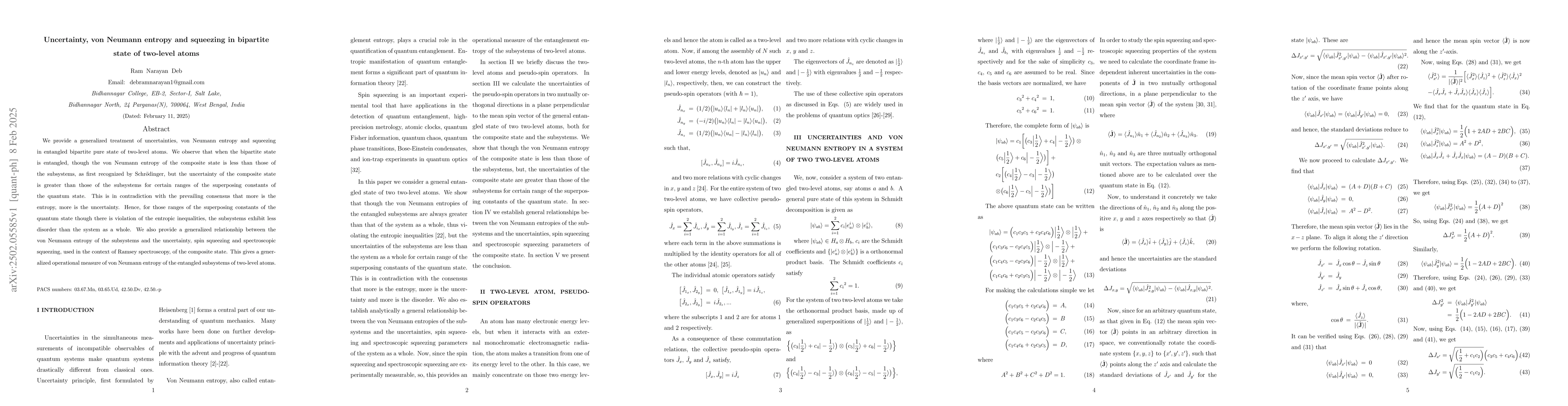 The paper presents a detailed mathematical analysis of uncertainties in bipartite entangled states of two-level atoms, introducing generalized relationships between von Neumann entropy and squeezing parameters.