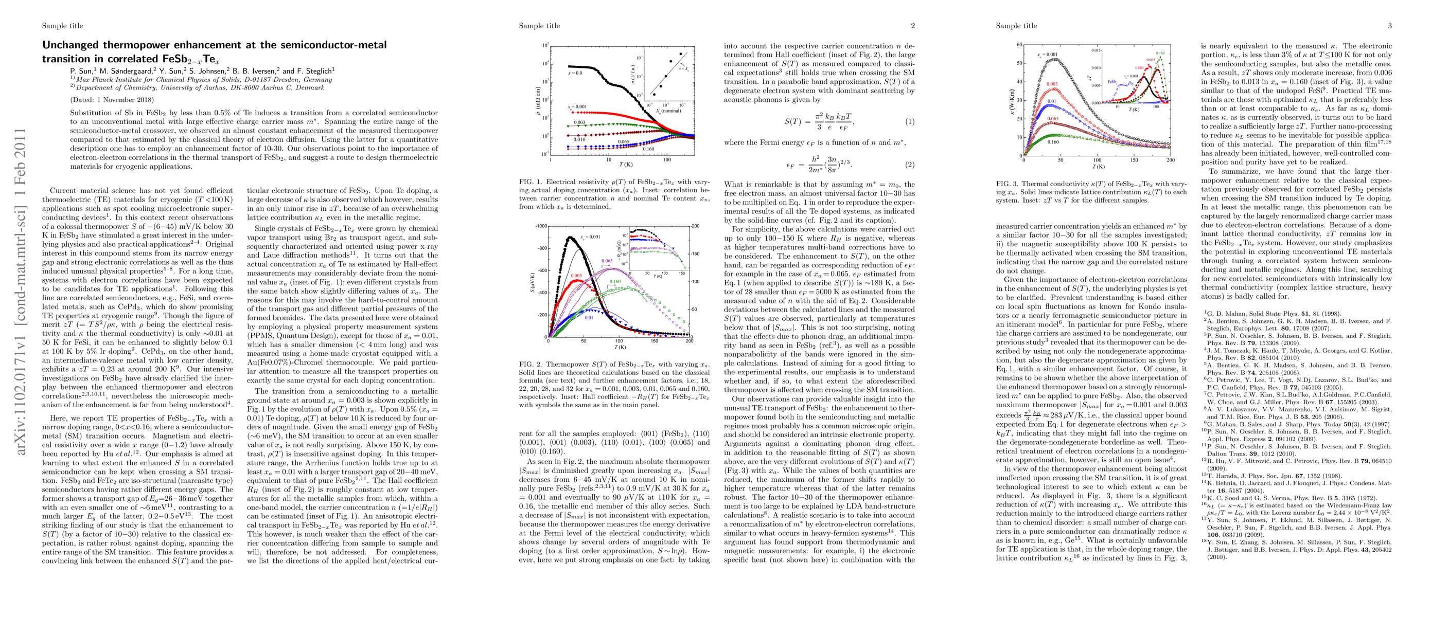 The paper presents a detailed analysis of thermoelectric properties in FeSb2-xTex, demonstrating the robustness of thermopower enhancement across the semiconductor-metal transition and its correlation with electron-electron correlations.