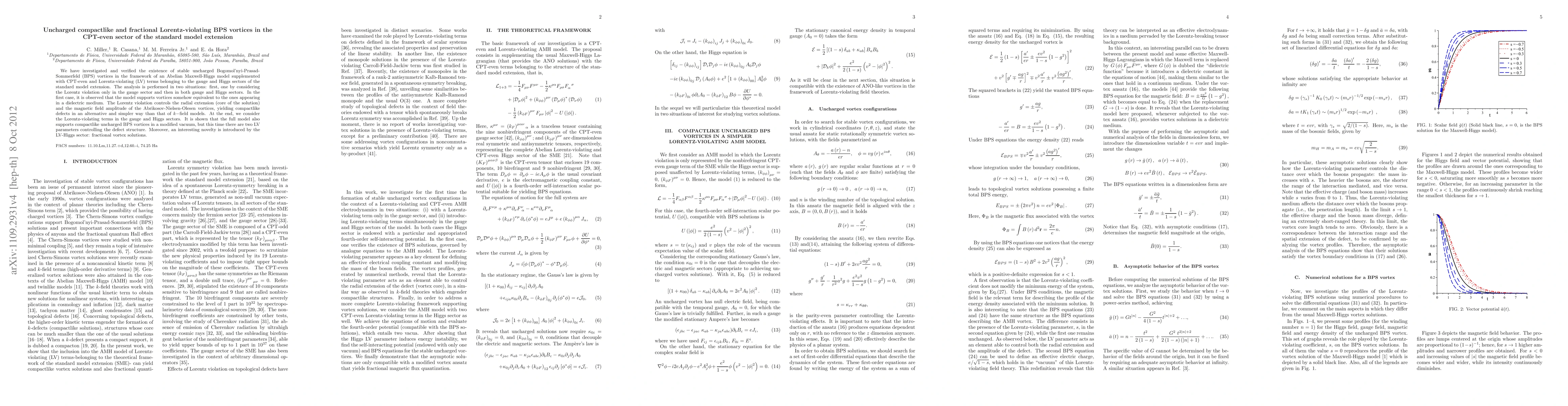 This paper explores stable, uncharged BPS vortices in an Abelian Maxwell-Higgs model with CPT-even and Lorentz-violating terms from the standard model extension, showing that Lorentz violation in the gauge sector produces compactlike defects similar to those in dielectric media, while violation in both gauge and Higgs sectors introduces fractional vortex solutions.