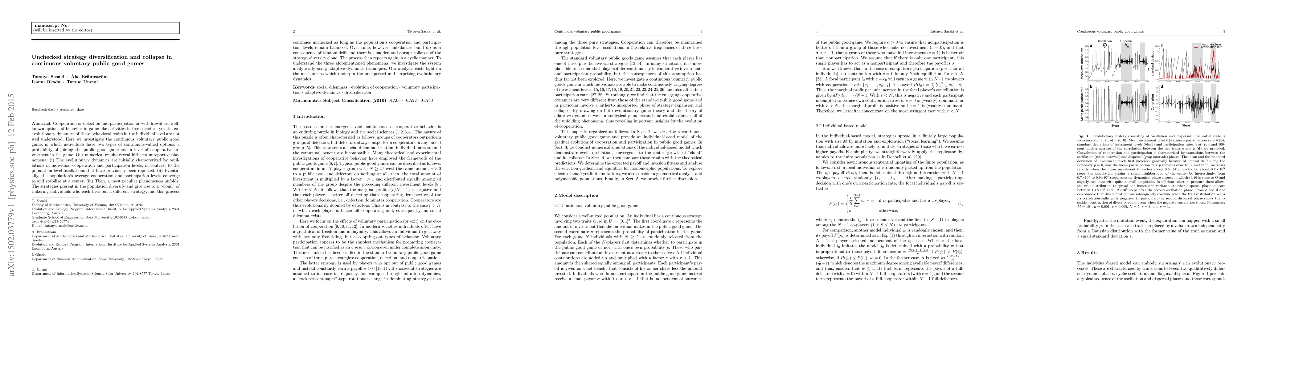 Cooperation or defection and participation or withdrawal are well-known options of behavior in game-like activities in free societies, yet the co-evolutionary dynamics of these behavioral traits in the individual level are not well understood. Here we investigate the continuous voluntary public good game, in which individuals have two types of continuous-valued options: a probability of joining the public good game and a level of cooperative investment in the game. Our numerical results reveal hitherto unreported phenomena: (i) The evolutionary dynamics are initially characterized by oscillations in individual cooperation and participation levels, in contrast to the population-level oscillations that have previously been reported. (ii) Eventually, the population's average cooperation and participation levels converge to and stabilize at a center. (iii) Then, a most peculiar phenomenon unfolds: The strategies present in the population diversify and give rise to a "cloud" of tinkering individuals who each tries out a different strategy, and this process continues unchecked as long as the population's cooperation and participation levels remain balanced. Over time, however, imbalances build up as a consequence of random drift and there is a sudden and abrupt collapse of the strategy-diversity cloud. The process then repeats again in a cyclic manner. To understand the three aforementioned phenomena, we investigate the system analytically using adaptive-dynamics techniques. Our analysis casts light on the mechanisms which underpin the unexpected and surprising evolutionary dynamics.