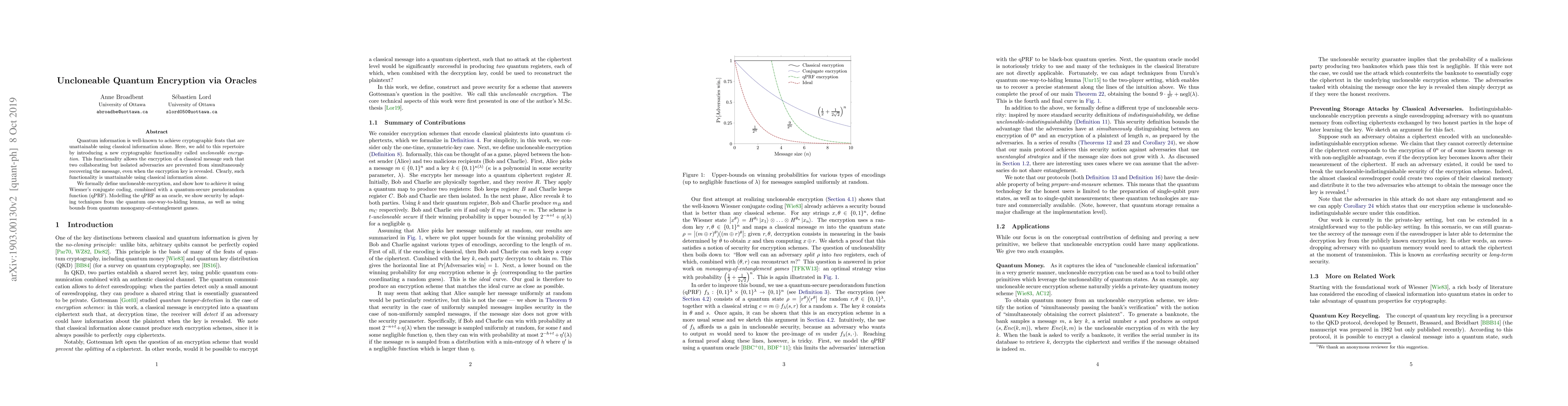 This paper introduces uncloneable quantum encryption, a novel cryptographic method that prevents two isolated adversaries from jointly recovering an encrypted message even when the key is disclosed. It achieves this using Wiesner's conjugate coding and a quantum-secure pseudorandom function modeled as a quantum random oracle, leveraging quantum monogamy-of-entanglement principles for security.