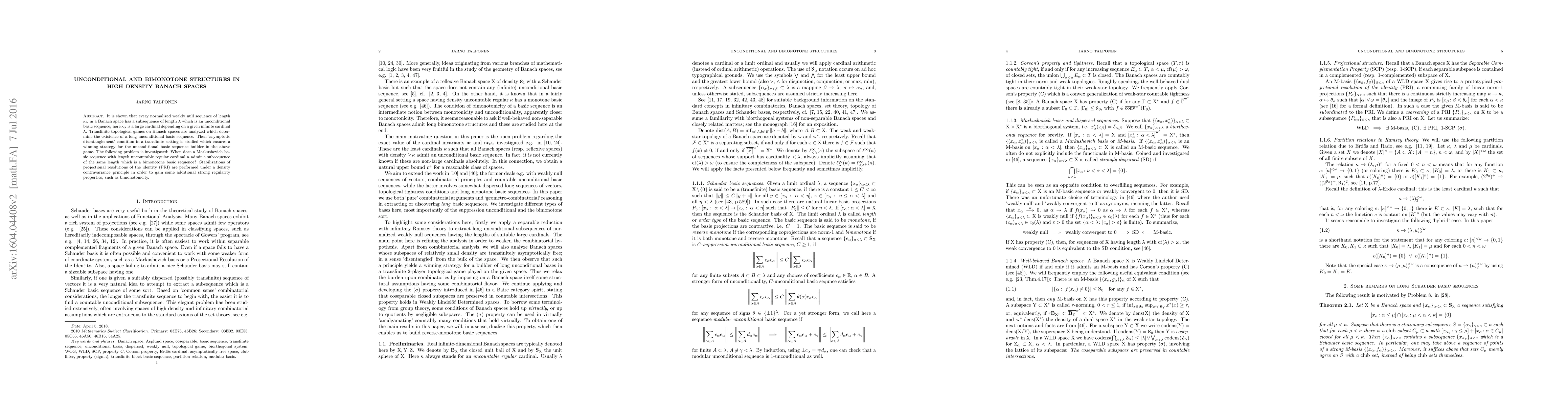 This paper explores the existence and properties of unconditional and bimonotone basic sequences in high-density Banach spaces, utilizing large cardinals and transfinite topological games to determine the conditions under which a normalized weakly null sequence can be refined into such sequences. It also investigates the stabilization of projectional resolutions under density contravariance principles to achieve bimonotonicity.