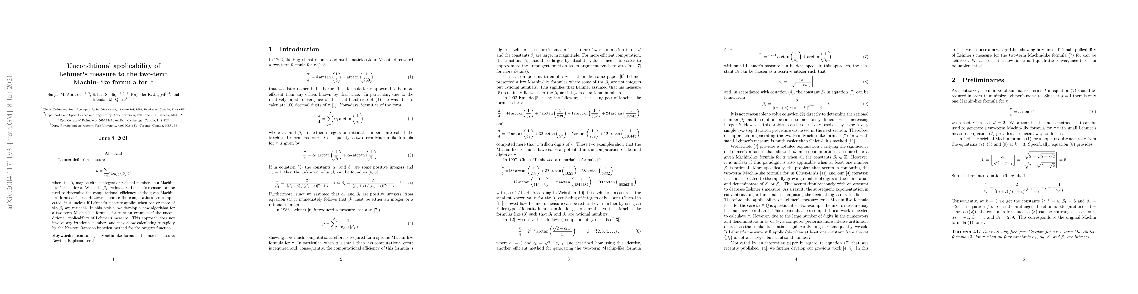 Lehmer defined a measure $$ \mu=\sum\limits_{j=1}^J\frac{1}{\log_{10}\left(\left|\beta_j\right|\right)}, $$ where the $\beta_j$ may be either integers or rational numbers in a Machin-like formula for $\pi$. When the $\beta_j$ are integers, Lehmer's measure can be used to determine the computational efficiency of the given Machin-like formula for $\pi$. However, because the computations are complicated, it is unclear if Lehmer's measure applies when one or more of the $\beta_j$ are rational. In this article, we develop a new algorithm for a two-term Machin-like formula for $\pi$ as an example of the unconditional applicability of Lehmer's measure. This approach does not involve any irrational numbers and may allow calculating $\pi$ rapidly by the Newton$-$Raphson iteration method for the tangent function.