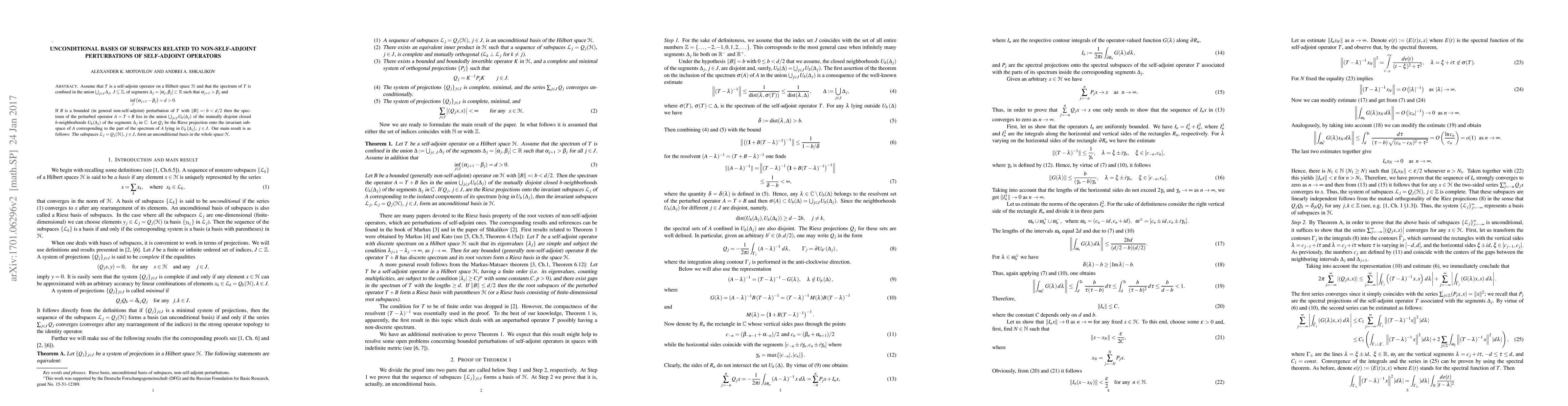 This paper investigates the spectral properties of self-adjoint operators perturbed by bounded non-self-adjoint operators. It demonstrates that the subspaces corresponding to the perturbed operator's spectrum form an unconditional basis in the original Hilbert space.