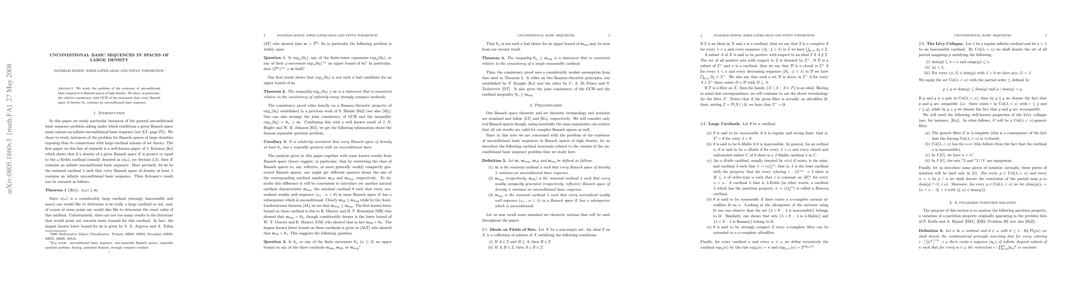 This paper investigates the existence of unconditional basic sequences in Banach spaces with high density, specifically proving the relative consistency with the Generalized Continuum Hypothesis (GCH) of the statement that every Banach space of density $\aleph_\omega$ contains such a sequence.