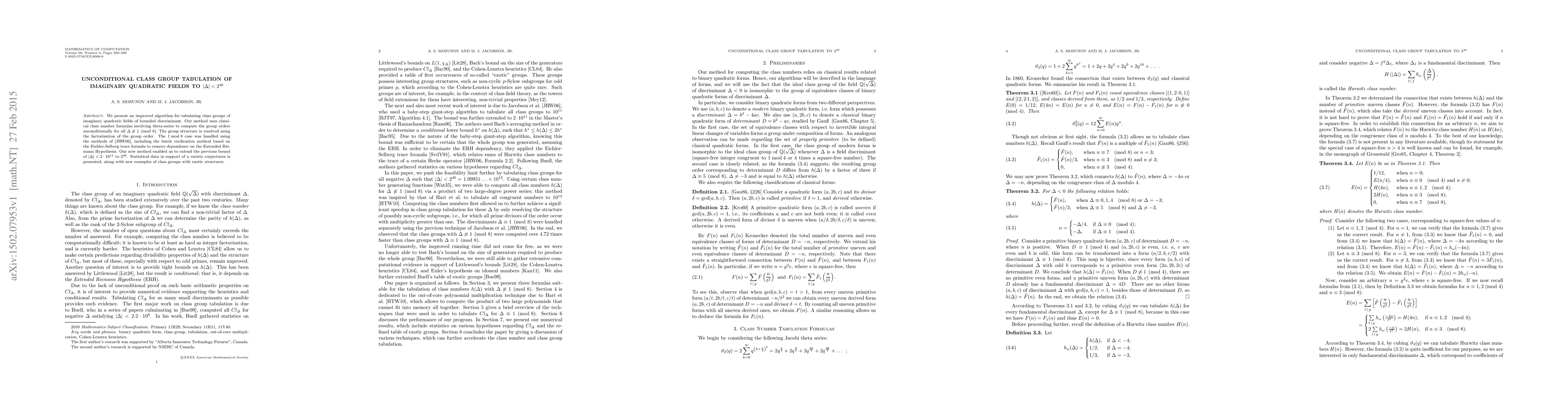 Researchers developed an algorithm to compute class groups of imaginary quadratic fields with bounded discriminants, extending a previous bound from $2 imes 10^{11}$ to $2^{40}$. The method uses classical formulas and factorization to resolve the group structure without relying on the Extended Riemann Hypothesis.