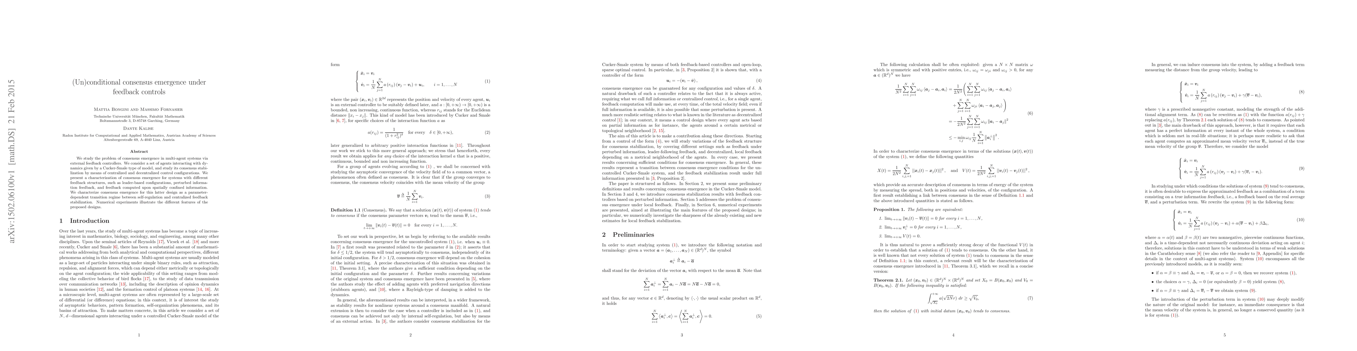 This paper investigates consensus stabilization in multi-agent systems using external feedback controllers based on a Cucker-Smale model. It characterizes consensus emergence under various feedback structures, including leader-based and spatially confined configurations, and identifies a transition regime between self-regulation and centralized stabilization. Numerical experiments demonstrate the effectiveness of the proposed designs.