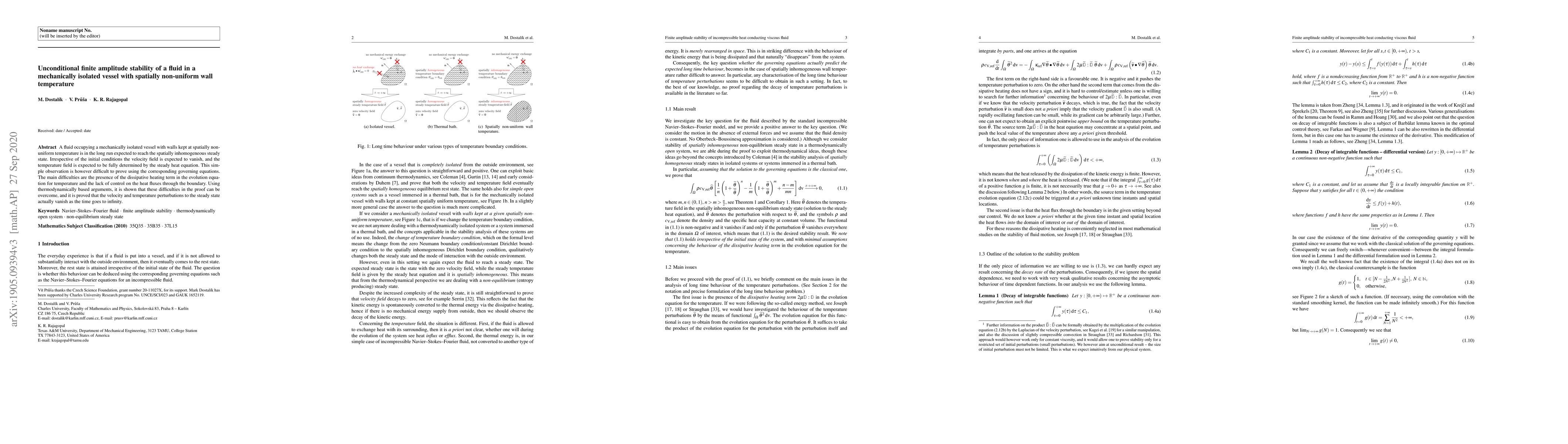 A fluid occupying a mechanically isolated vessel with walls kept at spatially non-uniform temperature is in the long run expected to reach the spatially inhomogeneous steady state. Irrespective of the initial conditions the velocity field is expected to vanish, and the temperature field is expected to be fully determined by the steady heat equation. This simple observation is however difficult to prove using the corresponding governing equations. The main difficulties are the presence of the dissipative heating term in the evolution equation for temperature and the lack of control on the heat fluxes through the boundary. Using thermodynamically based arguments, it is shown that these difficulties in the proof can be overcome, and it is proved that the velocity and temperature perturbations to the steady state actually vanish as the time goes to infinity.