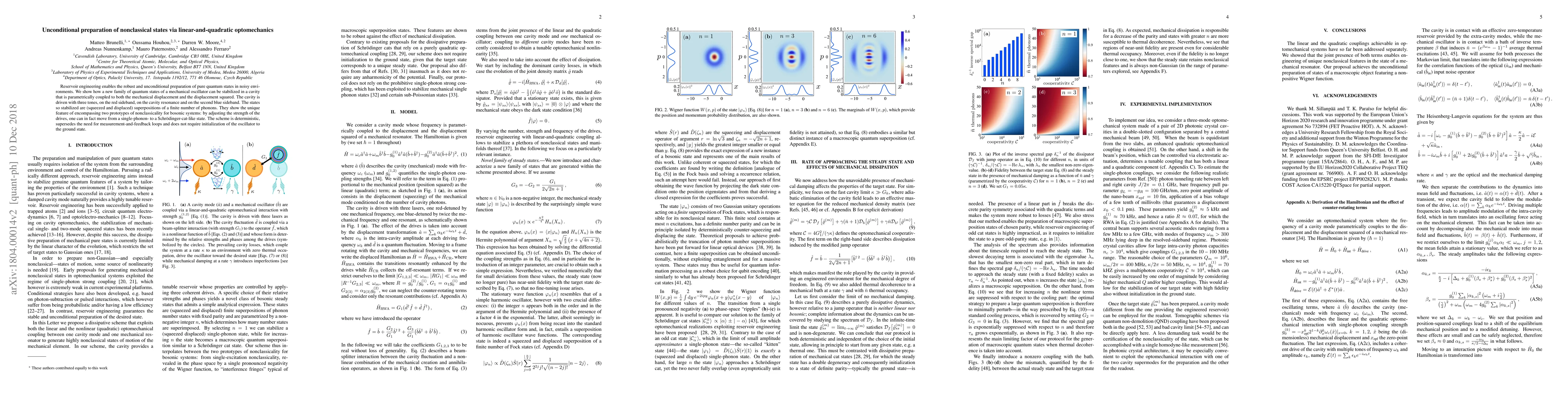 This paper presents a novel method for unconditionally preparing nonclassical states in a mechanical oscillator via linear-and-quadratic optomechanics, using a cavity driven by three tones. The stabilized states are squeezed and displaced phonon superpositions, capable of transitioning from single-phonon to Schrödinger-cat-like states without requiring ground state initialization or feedback loops.