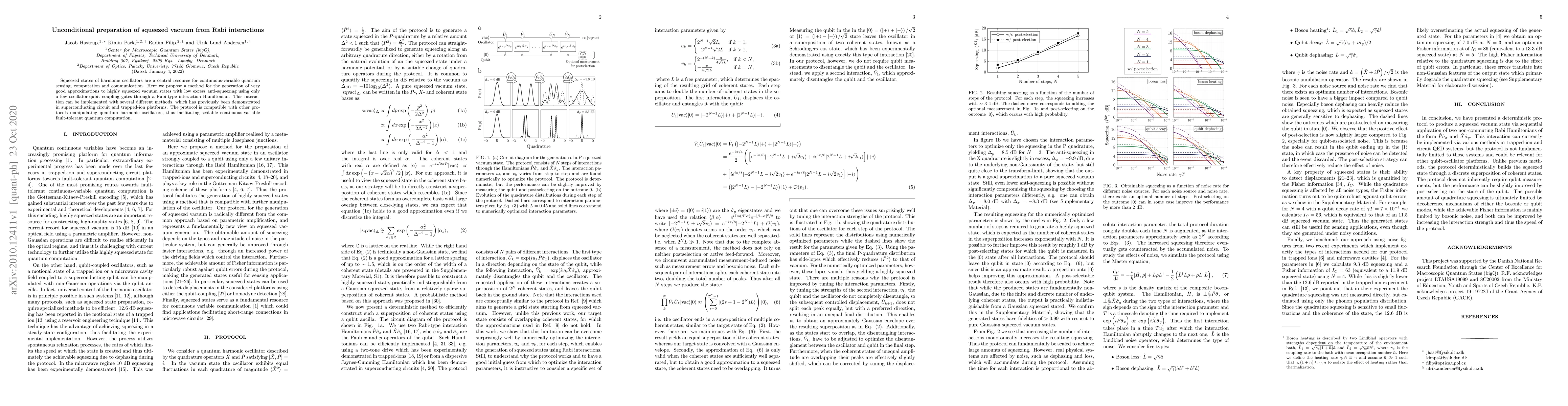 Squeezed states of harmonic oscillators are a central resource for continuous-variable quantum sensing, computation and communication. Here we propose a method for the generation of very good approximations to highly squeezed vacuum states with low excess anti-squeezing using only a few oscillator-qubit coupling gates through a Rabi-type interaction Hamiltonian. This interaction can be implemented with several different methods, which has previously been demonstrated in superconducting circuit and trapped-ion platforms. The protocol is compatible with other protocols manipulating quantum harmonic oscillators, thus facilitating scalable continuous-variable fault-tolerant quantum computation.