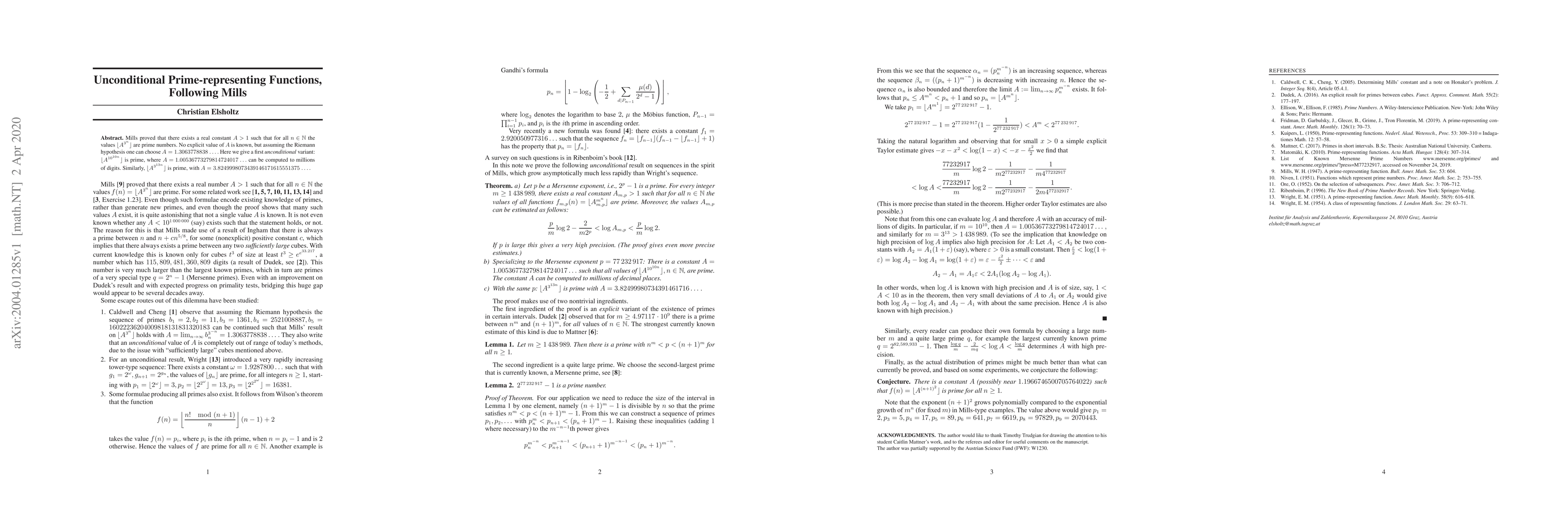 Mills proved that there exists a real constant $A>1$ such that for all $n\in \mathbb{N}$ the values $\lfloor A^{3^n}\rfloor$ are prime numbers. No explicit value of $A$ is known, but assuming the Riemann hypothesis one can choose $A= 1.3063778838\ldots .$ Here we give a first unconditional variant: $\lfloor A^{10^{10n}}\rfloor$ is prime, where $A=1.00536773279814724017\ldots$ can be computed to millions of digits. Similarly, $\lfloor A^{3^{13n}}\rfloor$ is prime, with $A=3.8249998073439146171615551375\ldots .$