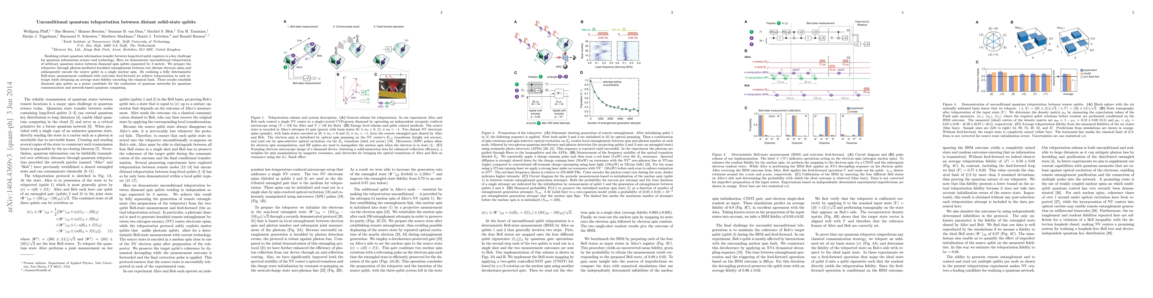 This paper reports on the successful teleportation of quantum states between diamond spin qubits 3 meters apart, using photon-mediated entanglement and real-time feed-forward, achieving high fidelity and positioning diamond spin qubits as leading candidates for quantum networks.