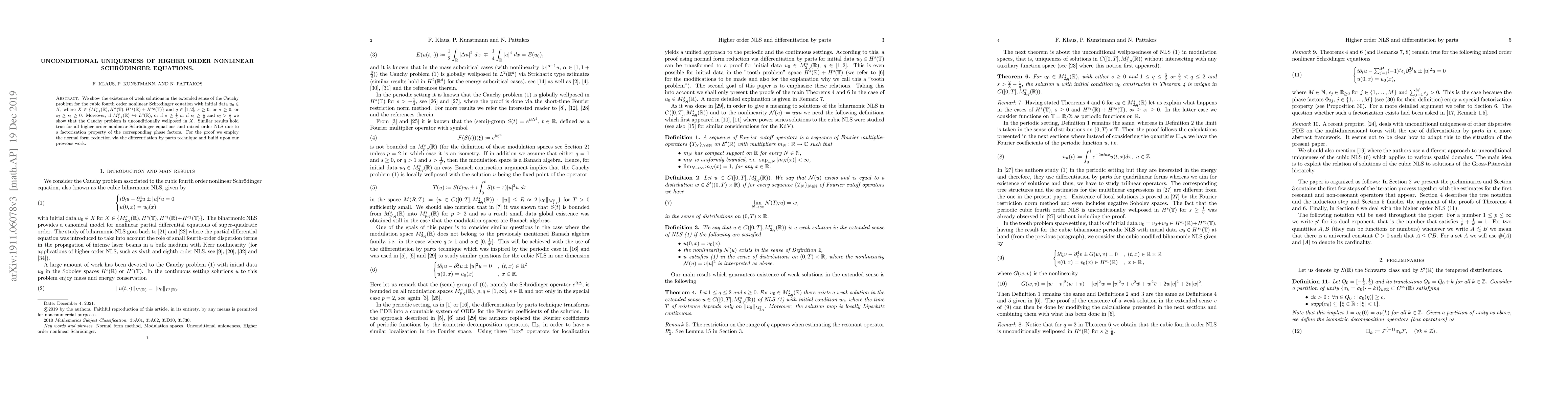 We show the existence of weak solutions in the extended sense of the Cauchy problem for the cubic fourth order nonlinear Schr\"odinger equation with initial data $u_{0}\in X$, where $X\in\{M_{2,q}^{s}(\mathbb R), H^{\sigma}(\mathbb T), H^{s_{1}}(\mathbb R)+H^{s_{2}}(\mathbb T)\}$ and $q\in[1,2]$, $s\geq0$, or $\sigma\geq0$, or $s_{2}\geq s_{1}\geq0$. Moreover, if $M_{2,q}^{s}(\mathbb R)\hookrightarrow L^{3}(\mathbb R)$, or if $\sigma\geq\frac16$ or if $s_{1}\geq\frac16$ and $s_{2}>\frac12$ we show that the Cauchy problem is unconditionally wellposed in $X$. Similar results hold true for all higher order nonlinear Schr\"odinger equations and mixed order NLS due to a factorization property of the corresponding phase factors. For the proof we employ the normal form reduction via the differentiation by parts technique and build upon our previous work