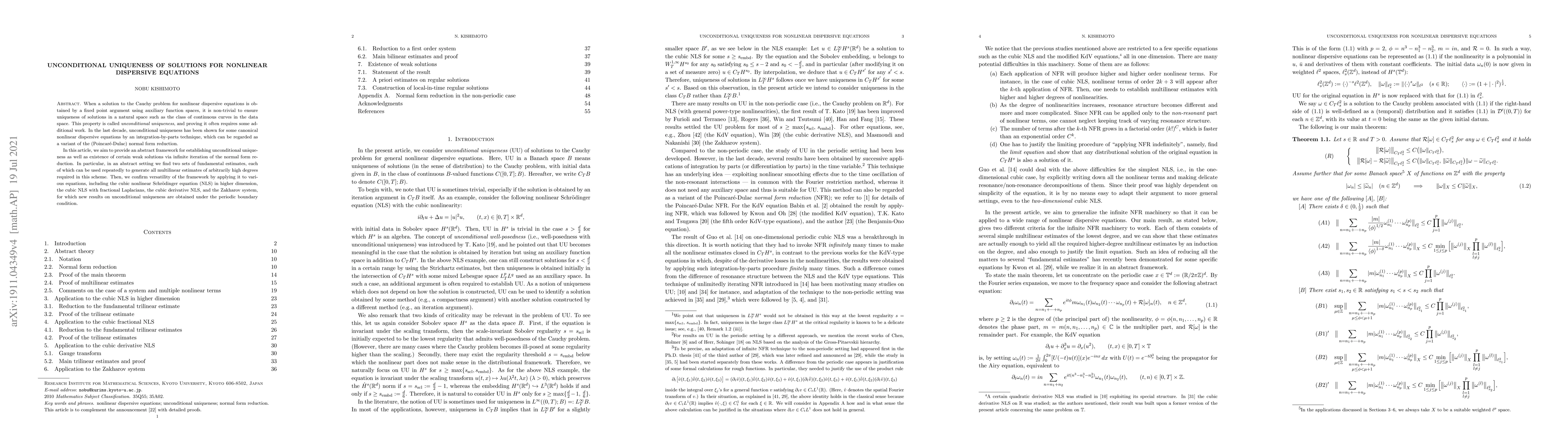 This paper establishes an abstract framework for proving unconditional uniqueness and existence of weak solutions for nonlinear dispersive equations through an infinite iteration of normal form reduction. The framework generates multilinear estimates to achieve these results, which are then applied to various equations including the cubic NLS and the Zakharov system.