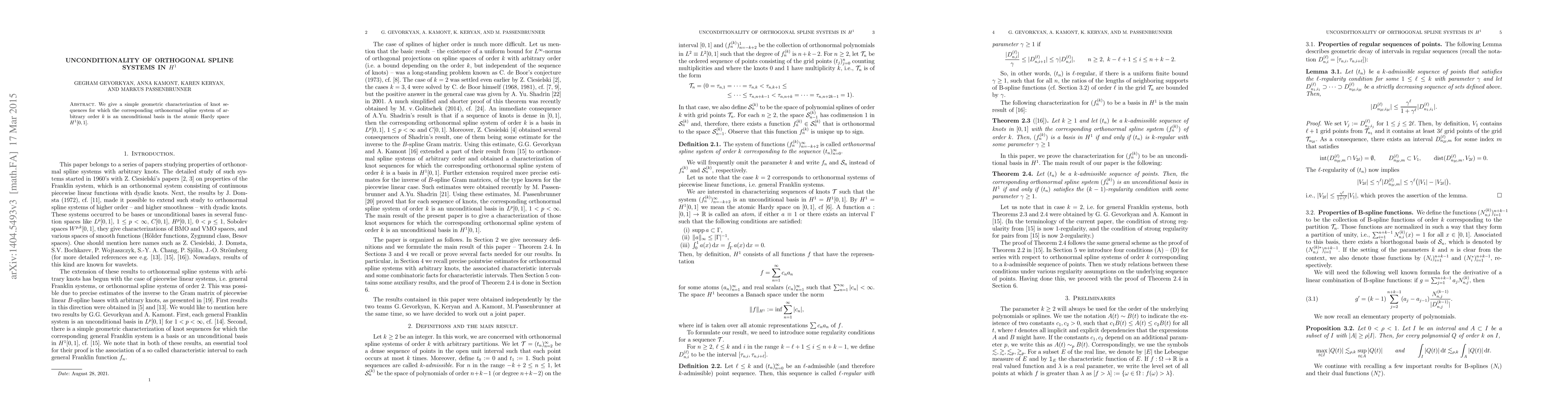 We give a simple geometric characterization of knot sequences for which the corresponding orthonormal spline system of arbitrary order $k$ is an unconditional basis in the atomic Hardy space $H^1[0,1]$.