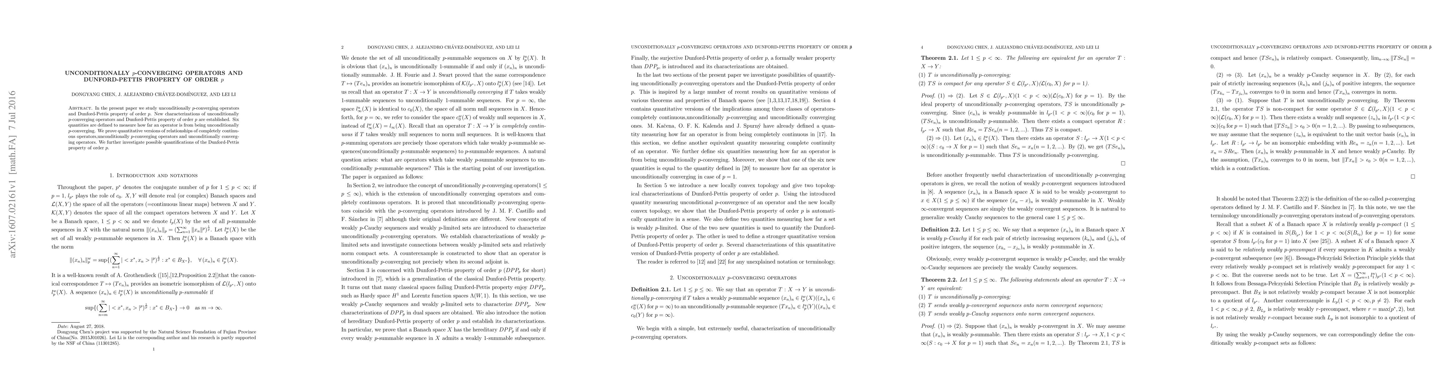 This paper introduces new characterizations for unconditionally $p$-converging operators and the Dunford-Pettis property of order $p$, defining six quantities to measure operator deviation from these properties and proving quantitative relationships between completely continuous, unconditionally $p$-converging, and unconditionally converging operators.