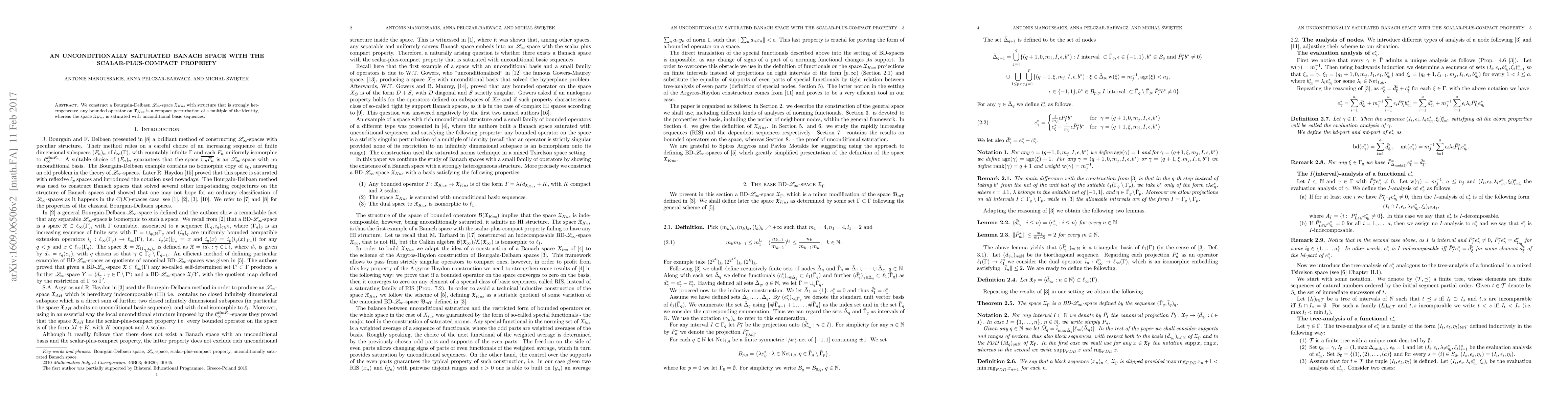 We construct a Bourgain-Delbaen $\mathscr{L}_\infty$-space $\mathfrak{X}_{Kus}$ with strongly heterogenous structure: any bounded operator on $\mathfrak{X}_{Kus}$ is a compact perturbation of a multiple of the identity, whereas the space $\mathfrak{X}_{Kus}$ is saturated with unconditional basic sequences.