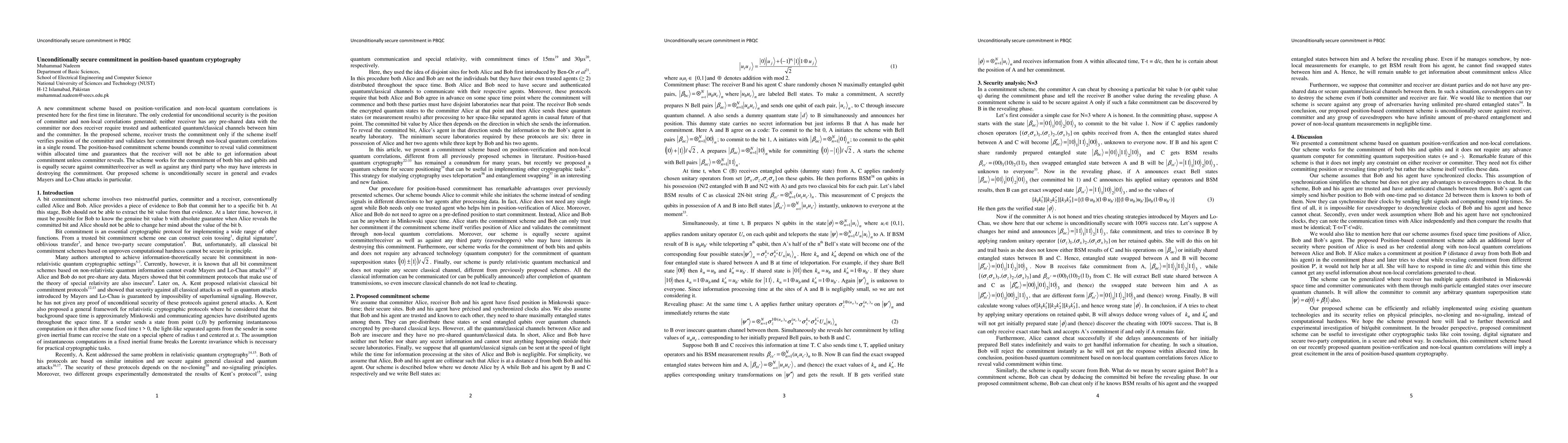 This research introduces a novel unconditionally secure commitment scheme in quantum cryptography, relying solely on the committer's position and non-local quantum correlations. The scheme ensures security without requiring pre-shared data or authenticated channels, validating commitment in a single round. It supports both bit and qubit commitments, offering resistance to various attacks, including those by Mayers and Lo-Chau.