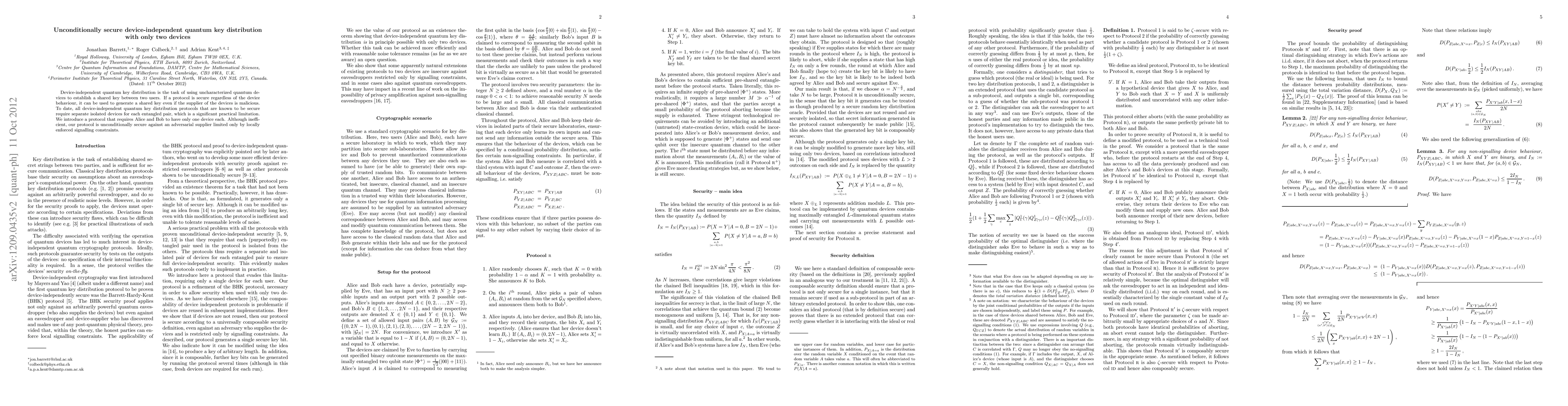 The research introduces a protocol for unconditionally secure device-independent quantum key distribution using only two devices, addressing a practical limitation of previous protocols requiring separate devices for each entangled pair.