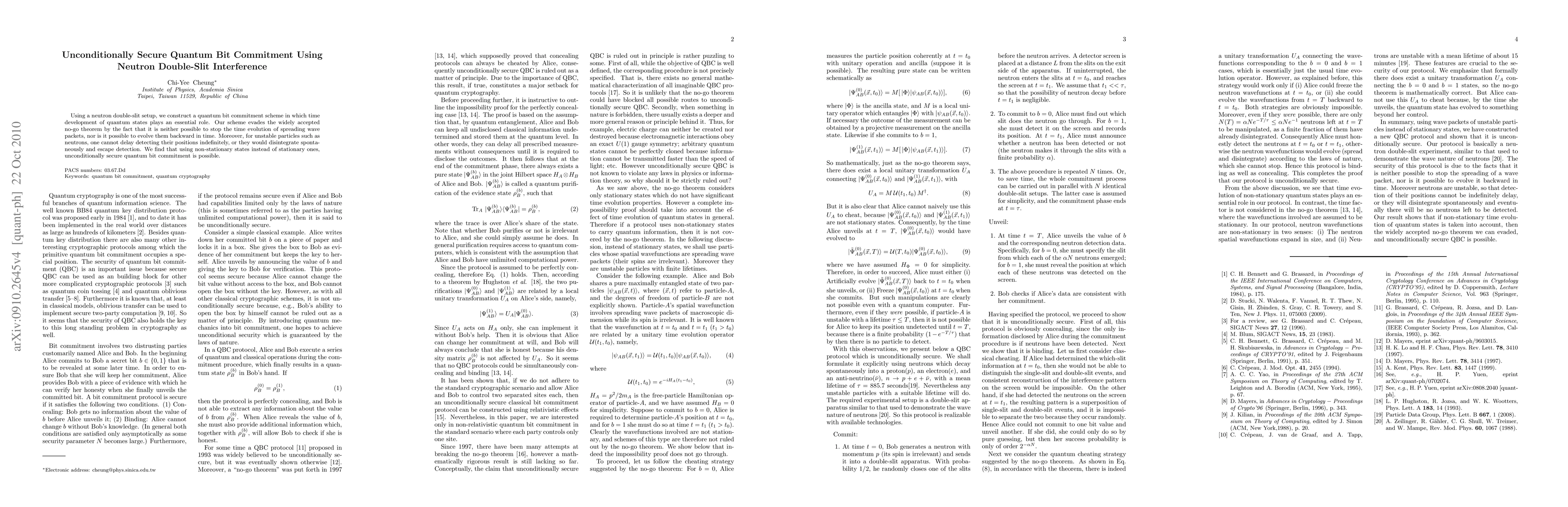 This paper presents a quantum bit commitment scheme using neutron double-slit interference, which leverages the time evolution of quantum states to achieve unconditional security, circumventing the no-go theorem by exploiting the irreversibility of neutron decay and wave packet spreading. The use of non-stationary states ensures secure commitment without the possibility of state manipulation or reversal.