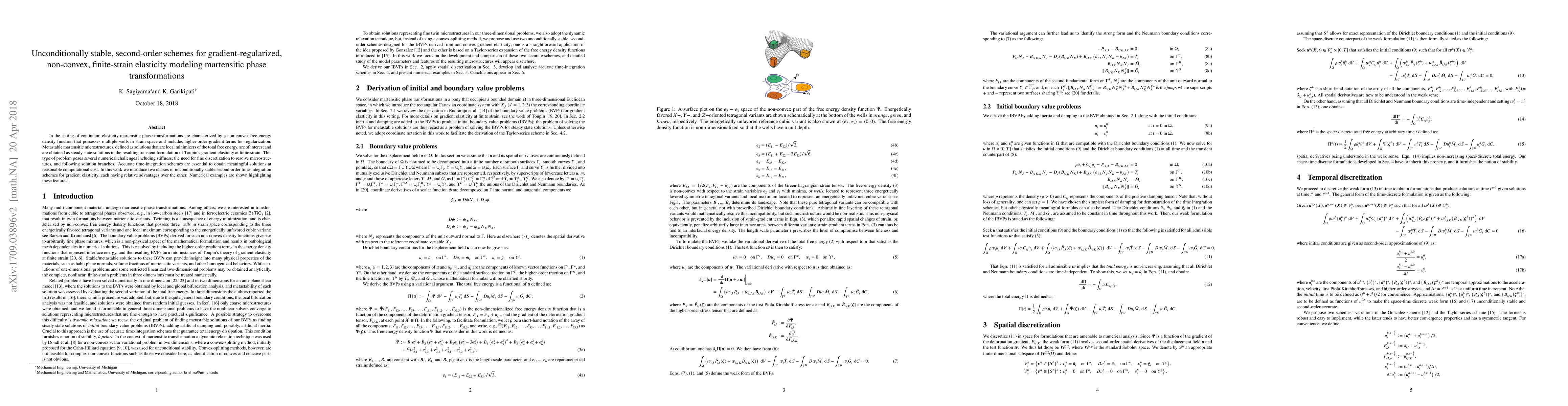 This paper introduces two unconditionally stable second-order time-integration schemes for gradient-regularized, non-convex finite-strain elasticity modeling of martensitic phase transformations. The schemes address numerical challenges such as stiffness and the need for fine discretization, providing stable and accurate solutions for metastable microstructures.