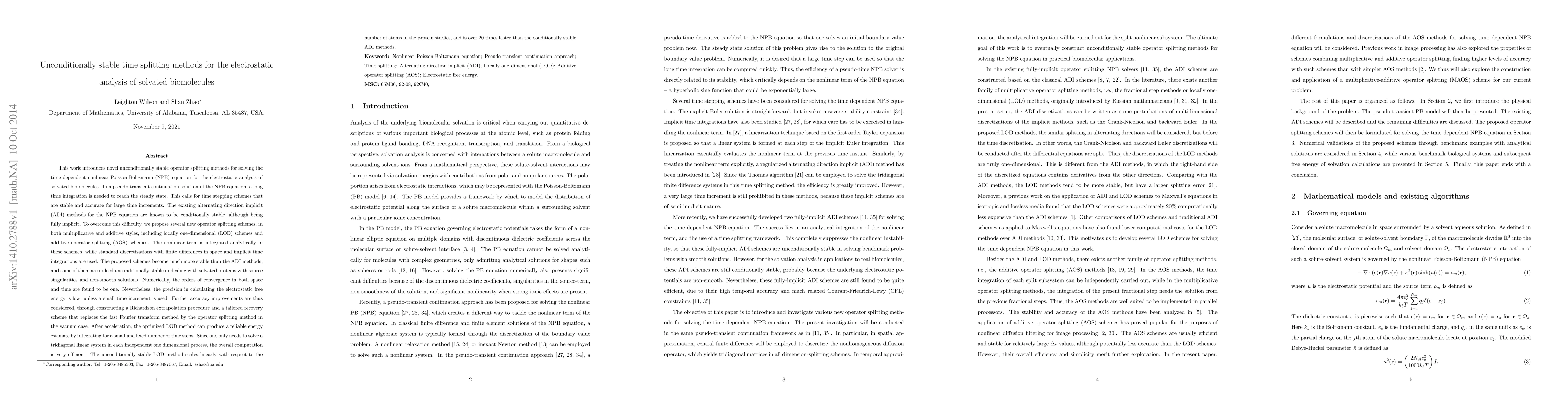 This paper proposes new unconditionally stable operator splitting methods for solving the nonlinear Poisson-Boltzmann equation in electrostatic analysis of solvated biomolecules, significantly improving stability over existing conditionally stable ADI methods. The optimized locally one-dimensional schemes achieve linear scalability and are over 20 times faster, though initial precision in energy calculations is low and requires small time increments.