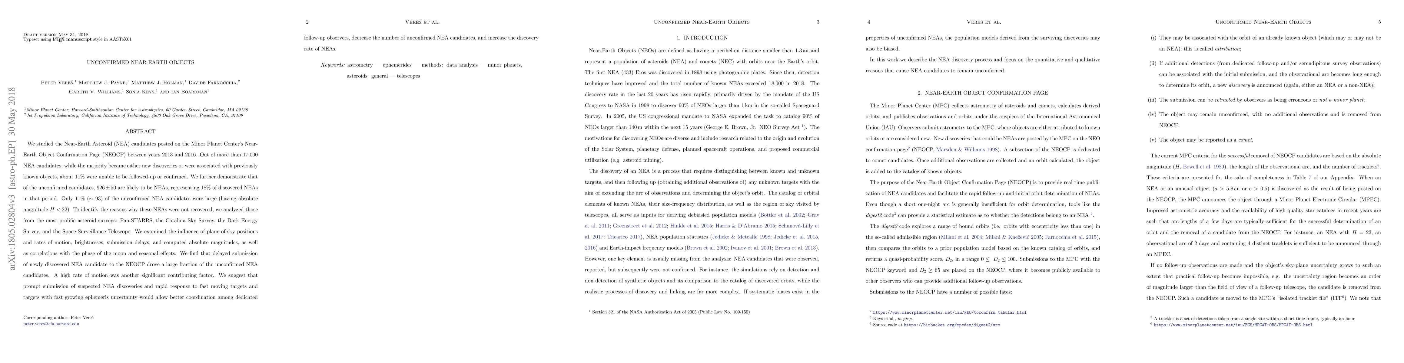 We studied the Near-Earth Asteroid (NEA) candidates posted on the Minor Planet Center's Near-Earth Object Confirmation Page (NEOCP) between years 2013 and 2016. Out of more than 17,000 NEA candidates, while the majority became either new discoveries or were associated with previously known objects, about 11% were unable to be followed-up or confirmed. We further demonstrate that of the unconfirmed candidates, 926+/-50 are likely to be NEAs, representing 18% of discovered NEAs in that period. Only 11% (~93) of the unconfirmed NEA candidates were large (having absolute magnitude H<22). To identify the reasons why these NEAs were not recovered, we analyzed those from the most prolific asteroid surveys: Pan-STARRS, the Catalina Sky Survey, the Dark Energy Survey, and the Space Surveillance Telescope. We examined the influence of plane-of-sky positions and rates of motion, brightnesses, submission delays, and computed absolute magnitudes, as well as correlations with the phase of the moon and seasonal effects. We find that delayed submission of newly discovered NEA candidate to the NEOCP drove a large fraction of the unconfirmed NEA candidates. A high rate of motion was another significant contributing factor. We suggest that prompt submission of suspected NEA discoveries and rapid response to fast moving targets and targets with fast growing ephemeris uncertainty would allow better coordination among dedicated follow-up observers, decrease the number of unconfirmed NEA candidates, and increase the discovery rate of NEAs.