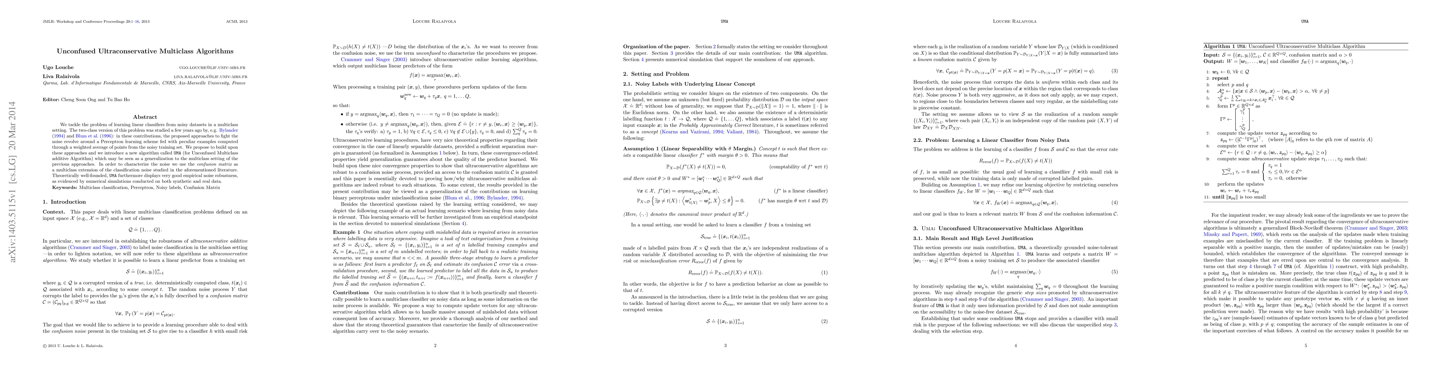 This paper introduces UMA, a novel multiclass algorithm for learning linear classifiers from noisy datasets, extending previous Perceptron-based methods. The algorithm leverages a confusion matrix to characterize noise and demonstrates strong empirical robustness against noise in both synthetic and real data.