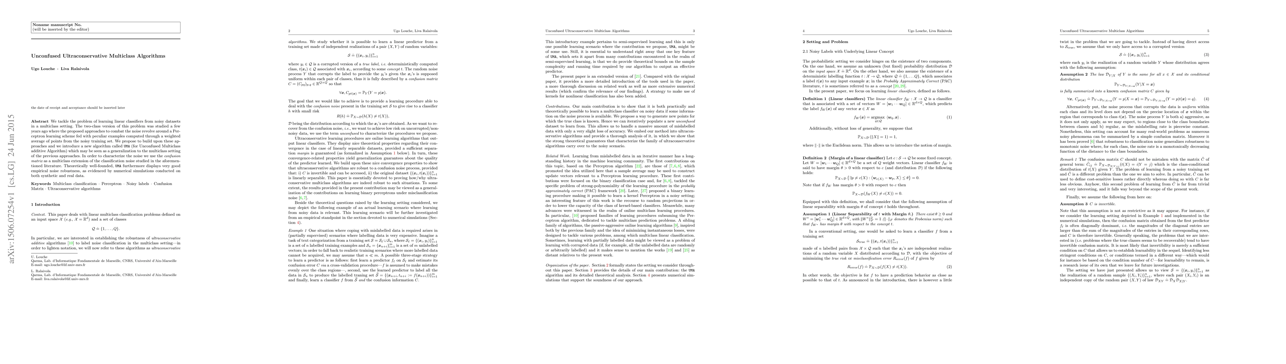 This paper introduces UMA, an Unconfused Multiclass additive Algorithm for learning linear classifiers from noisy multiclass datasets. The algorithm generalizes previous two-class approaches and uses a confusion matrix to characterize noise, demonstrating strong empirical robustness in simulations on synthetic and real data.