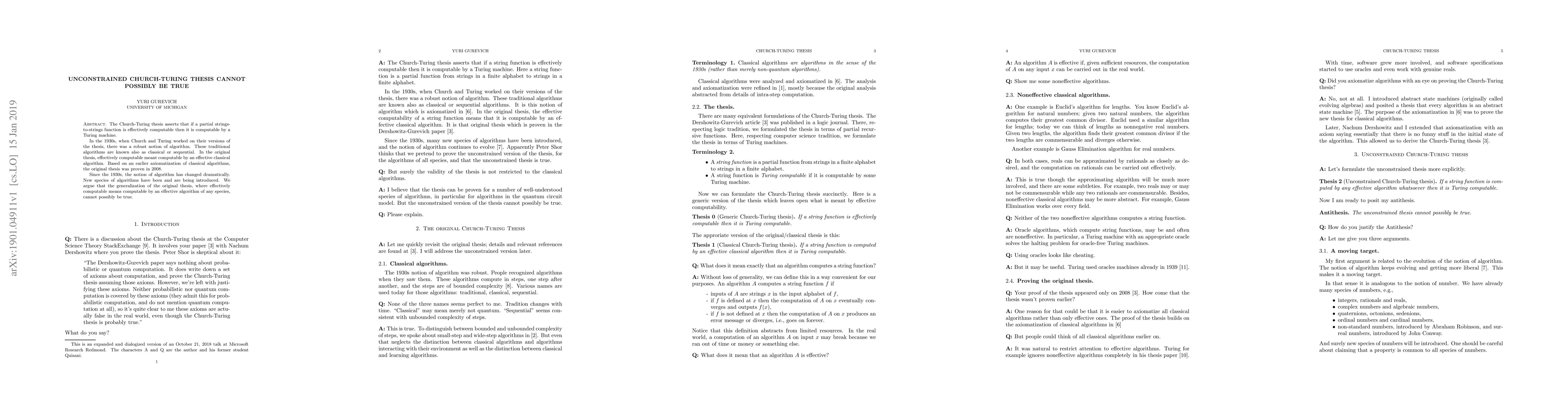 The Church-Turing thesis originally stated that any effectively computable function can be computed by a Turing machine, but this holds true only for classical algorithms. With the emergence of new algorithmic species, the unconstrained generalization of the thesis to all algorithms is argued to be false.
