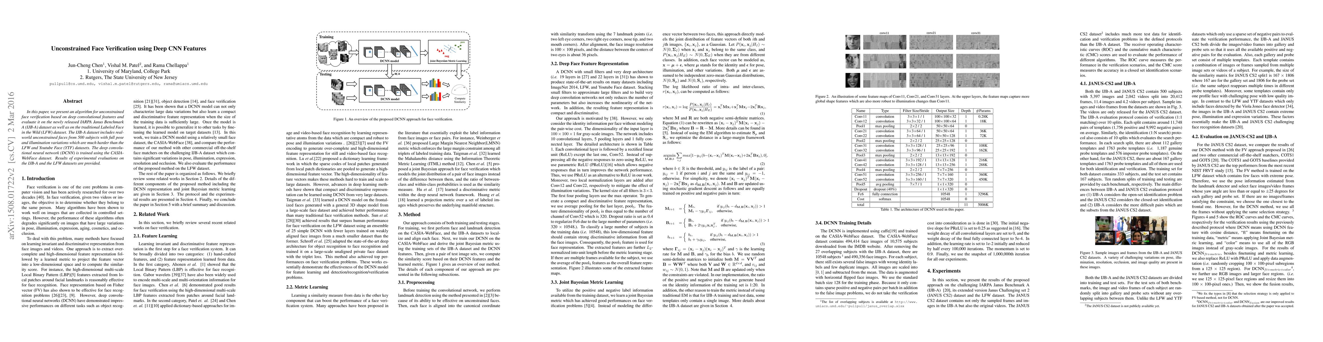 This paper proposes an algorithm for unconstrained face verification using deep convolutional neural network (DCNN) features, evaluated on the IJB-A dataset featuring challenging real-world variations. The DCNN is trained on the CASIA-WebFace dataset, and extensive experiments demonstrate its effectiveness.