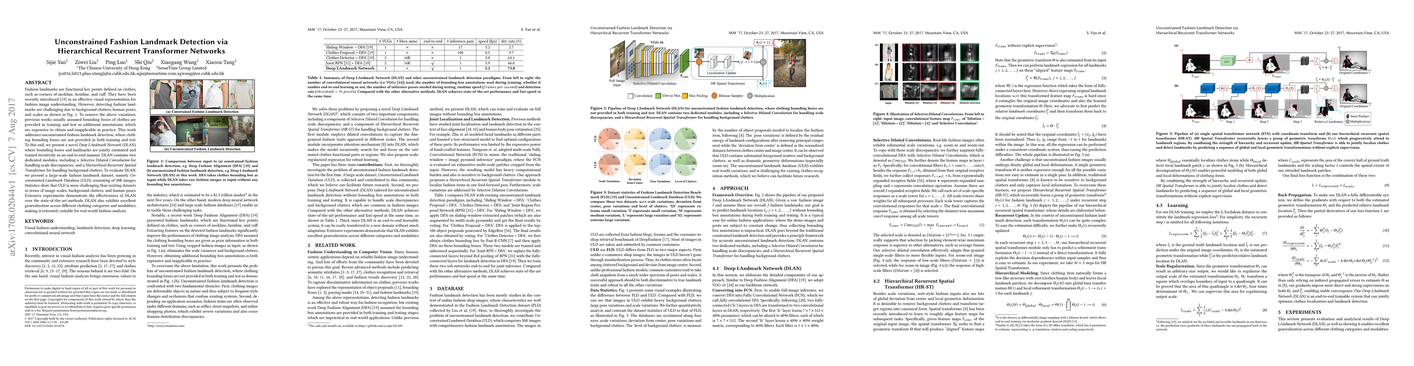 This paper introduces a Deep LAndmark Network (DLAN) for detecting fashion landmarks without requiring clothing bounding boxes, addressing challenges like scale discrepancies and background clutters. The method uses a Selective Dilated Convolution and a Hierarchical Recurrent Spatial Transformer, and it is evaluated on a new large-scale dataset, the Unconstrained Landmark Database (ULD), showing superior performance over existing methods.